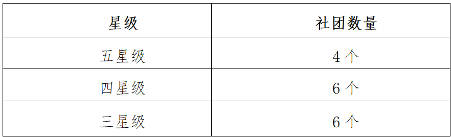 (二)星级评定:其中社团年度审核成绩为良好及以上的学生社团有资格进行社团星级评定,星级评定级别分为三星级社团、四星级社团和五星级社团。