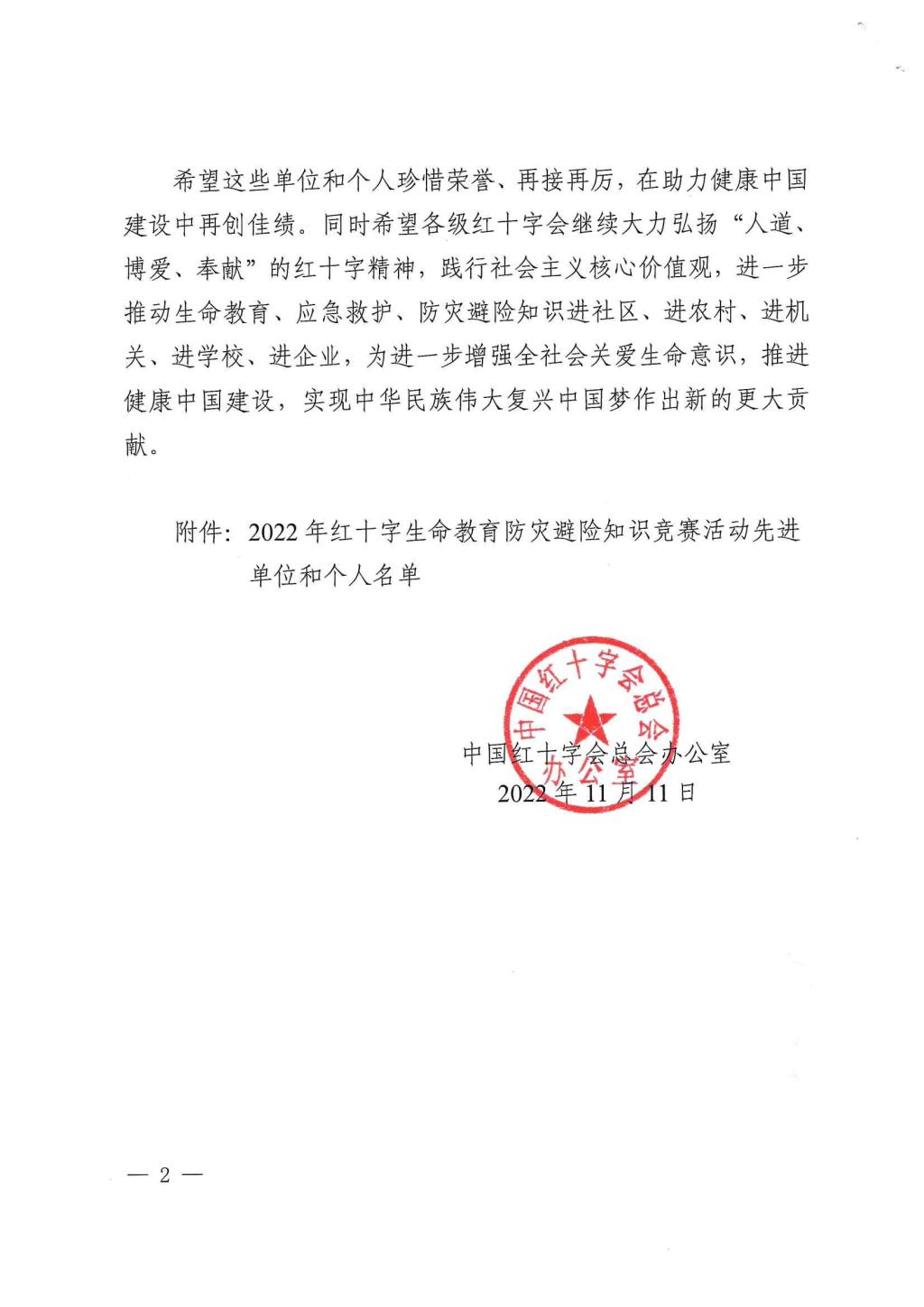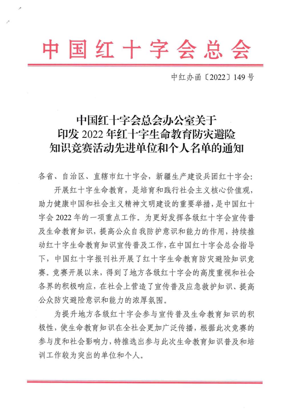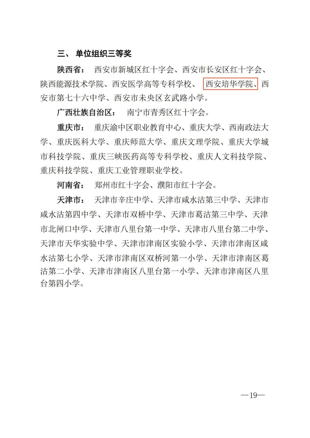 2022年11月11日,中国红十字会发布《中国红十字会总会办公室关于印发2022年红十字生命教育防灾避险知识竞赛活动先进单位和个人名单的通知》(中红办函[2022]149号)中,西安培华学院获得2022年红十字生命教育防灾避险知识竞赛活动先进单位组织三等奖。