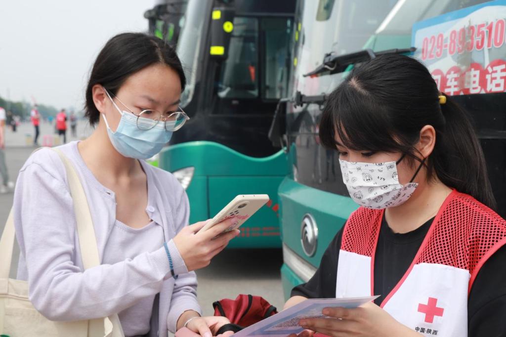 学校安排了便捷舒适的返校大巴,志愿者引导新生到达上车点,在完成扫描陕西一码通、测量体温、手部消杀的流程后,帮助新生将行李放入行李舱,确保他们全部安全上车之后,随车志愿者陪同新生一同抵校。
