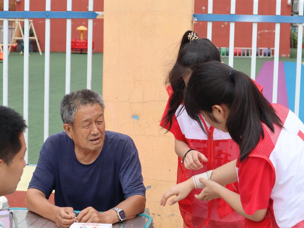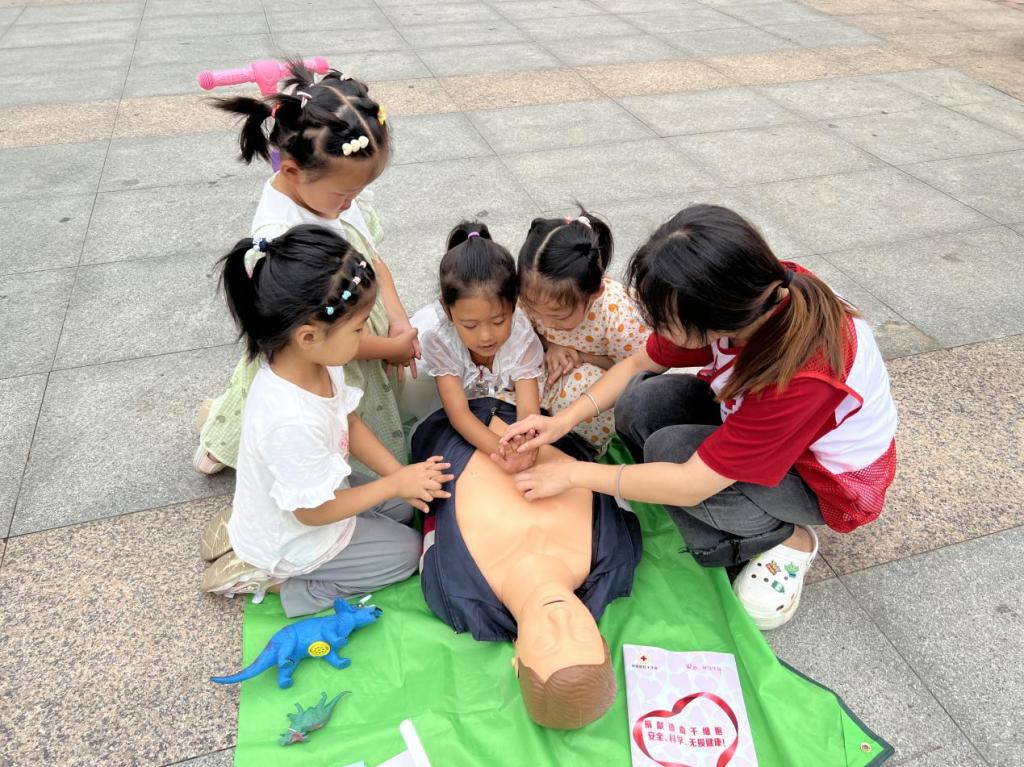 实践队成员借助模拟人现场演示心肺复苏操作步骤,并邀请小朋友亲自动手体验。现场的小朋友们跃跃欲试,纷纷主动上前进行心肺复苏模拟演练,深度体验胸外按压操作。