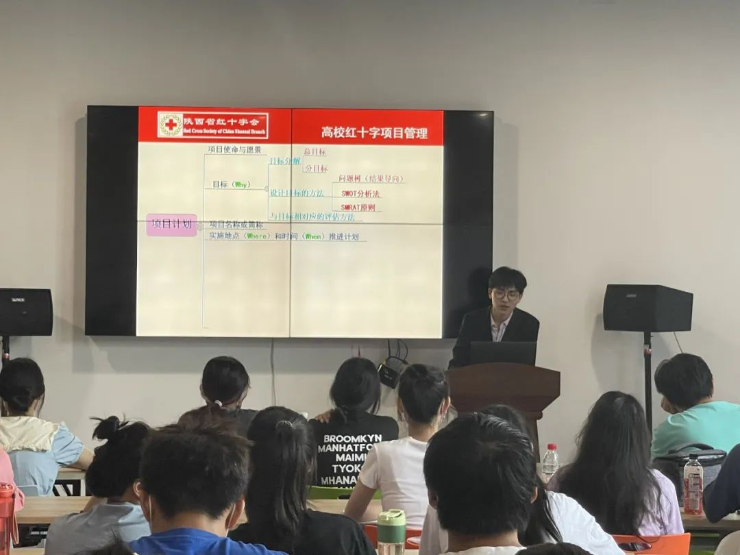 西安培华学院红十字会副会长宋文博学长进行理论知识培训,讲解了红十字志愿服务五常法以及高校红十字会项目管理的流程,之后让同学们自行组队进行实践活动——问题树分析法分析项目,这次活动加强了同学们对理论知识的学习和运用。
