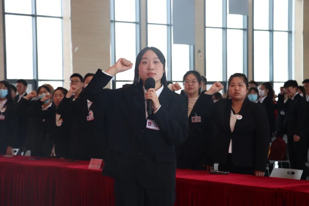 ▲西安培华学院红十字会学生分会副会长刘佳璇带领全体会员进行宣誓红十字誓词