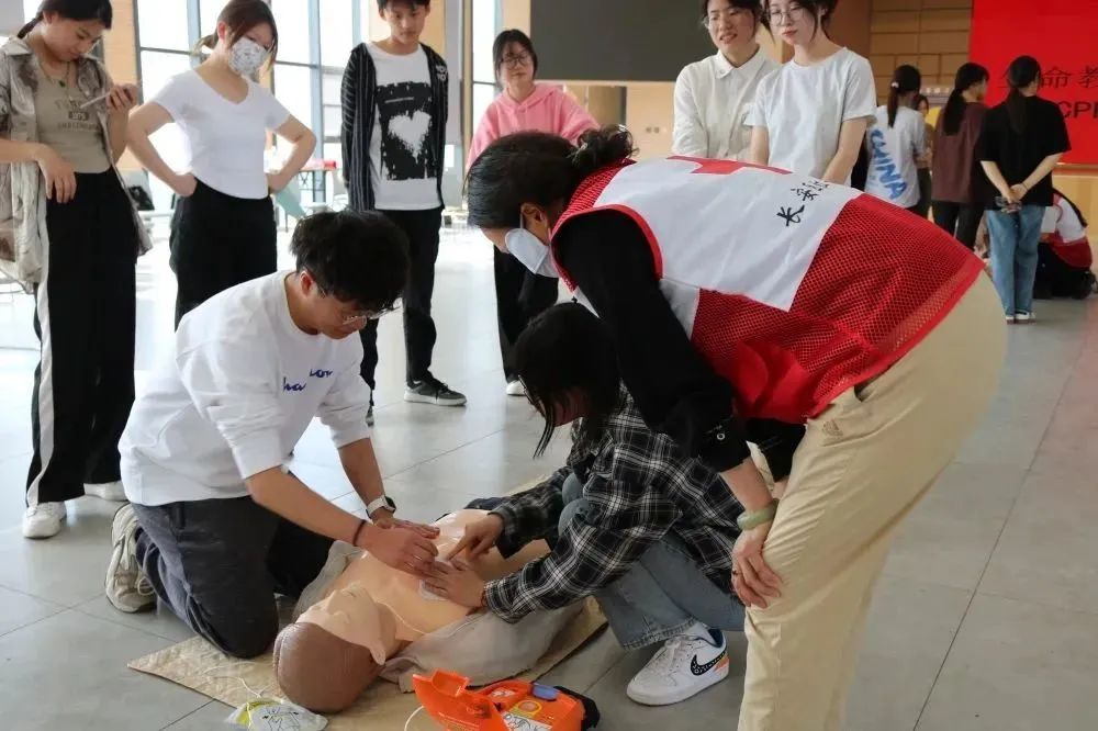 两位老师互相配合,展示应急救护的基本流程,随后老师们对所有参与应急救护培训的同学进行了分组实践操作,逐步纠错,规范学员的基本操作流程和操作方式。