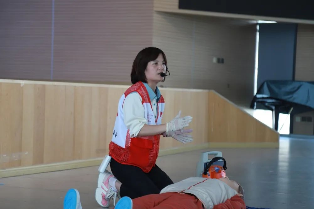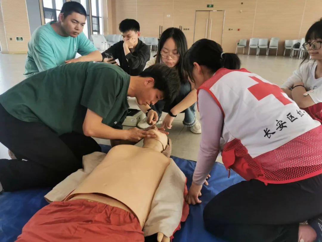 (1)心肺复苏CDR5月12日下午,西安市长安区红十字会陈莉讲师通过案例分析和互动的方式讲解了黄金四分钟、心肺复苏、AED(体外除颤仪)的使用和气道异物梗阻等知识。并用实际演示借助模拟人现场演示了心肺复苏的操作流程。