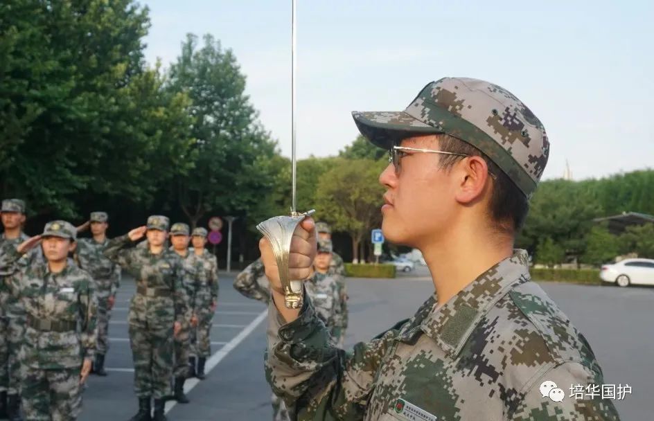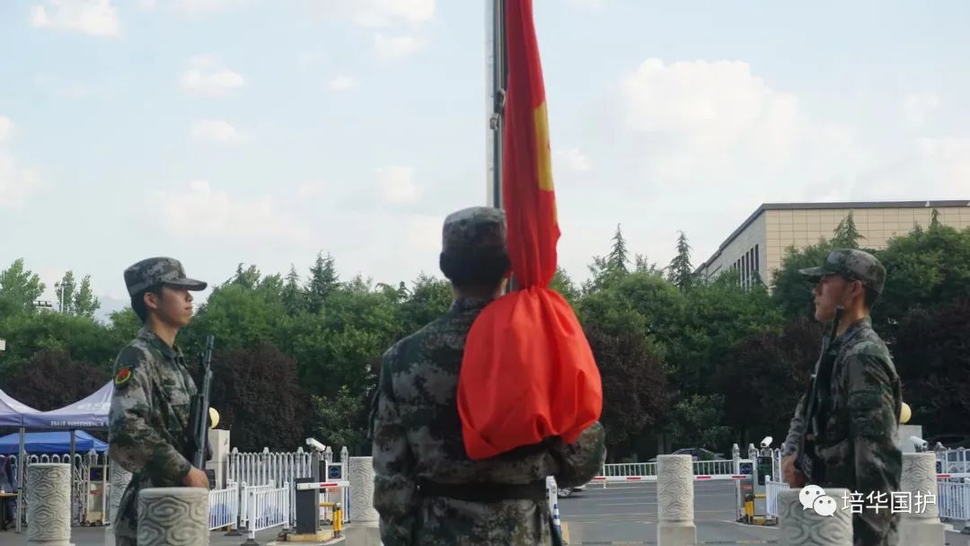 骄阳似火,暑气留恋。国旗护卫队队员齐聚南门,参加了庄严的降旗仪式。降旗队列肃立于晚霞之下,排面整齐,神情庄重,满怀着对祖国的爱意和对国旗的敬意,踏着铿锵有力的步伐,一步一步走向旗台。