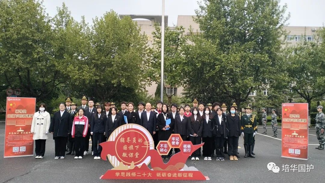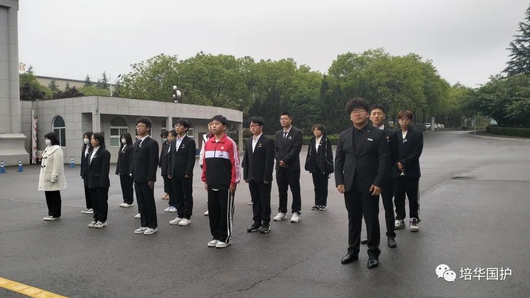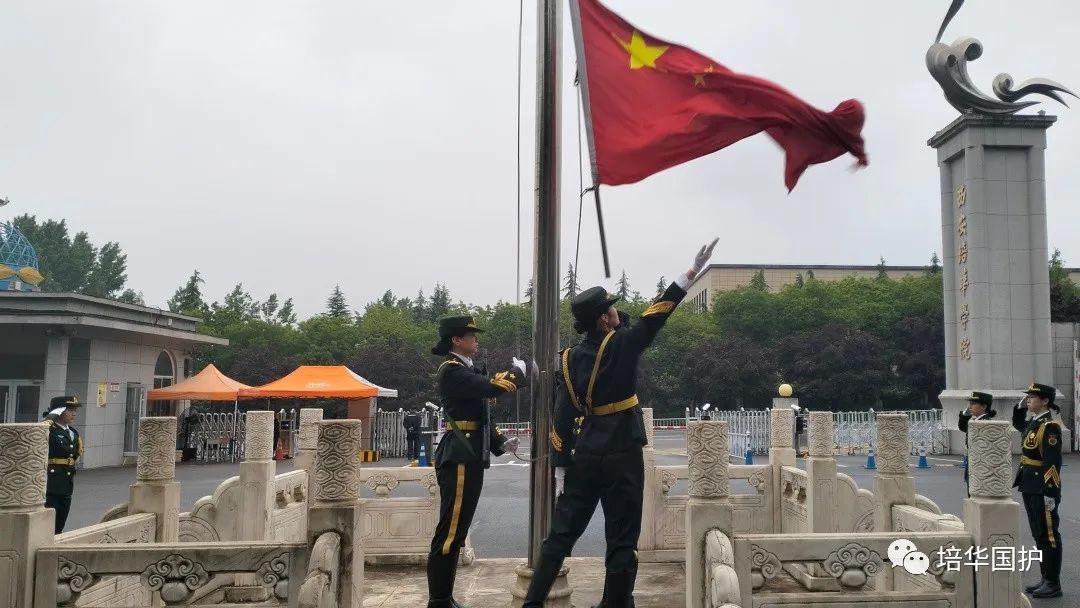 清早,一支整齐的队伍在培华校园的路上集结出发,踏着整齐划一的步伐,迎晨曦南行。队员们军装笔挺,帽徽、肩章、领带、绶带、腰带整理的一丝不苟,洁白的手套和漆黑的皮靴划出完美的弧线,刀手所执的佩刀在朝阳下熠熠生辉。候场场地,国旗的红、晨光的金、军装的绿,组成了国旗护卫队第八周周一清晨的色彩。