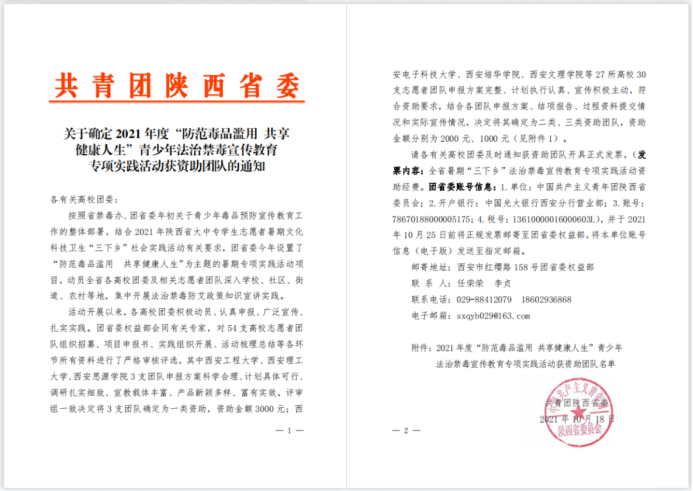 在2021年陕西省大中专学生“三下乡”社会实践活动中,我校禁毒防艾宣讲队申报的“以青春之名,陪你健康成长”项目在陕西省2021年度“防范毒品滥用 共享健康人生”青少年法治禁毒宣传教育专项实践活动中成功立项。同时,经过共青团陕西省委对申报的54支高校志愿者团队从组织招募、项目申报书、实践组织开展、活动梳理总结等各环节进行严格审核评选,我校禁毒防艾实践队被评为陕西省2021年度“禁毒防艾青少年法治禁毒宣传教育专项实践活动获资助团队”,资助金额2000元(二类资助)。