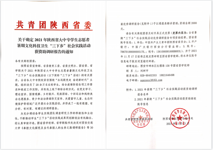 在共青团陕西省委开展的2021年陕西省暑期“三下乡”社会实践活动调研报告评选工作中,我校爱康社会实践队撰写的《凤鸣镇卫生服务建设及村民中医药健康素养现状的调研报告》获评陕西省2021年暑期“三下乡”社会实践活动“优秀调研报告”荣誉称号,并获资助2000元。