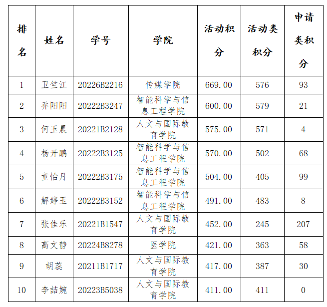 2023年个人积分增长分数最高的同学来自传媒学院,其中活动类积分占比较多,申请类积分占比较低。