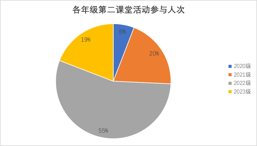 如下表所示,2023年度活动参与情况中,2021级、2022级和2023级学生参与活动总人数占比94.14%,2020级学生参与总人数占比不足10%。