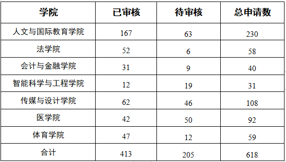 四月份第二课堂学风建设类积分申请总计618次,其中已审核423次,待审核205次;人文与国际教育学院总申请数最高为230次,智能科学与工程学院最少为31次。