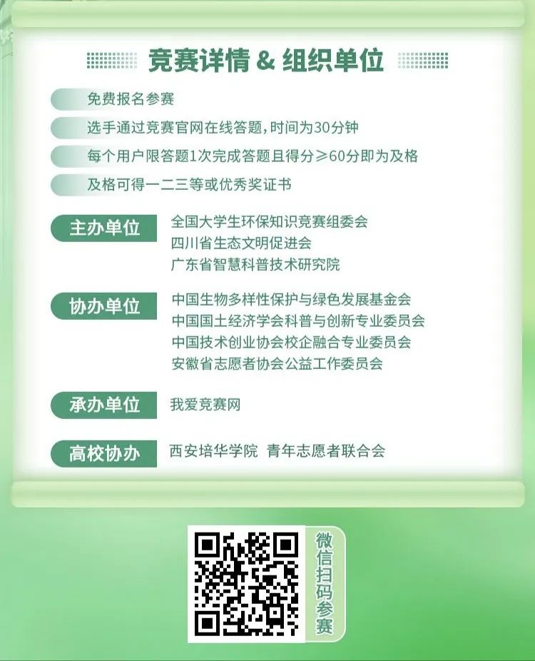 为深入贯彻生态环境保护与绿色发展理念,在2025年第56个“世界地球日”(4月22日)和第53个“世界环境日”(6月5日)来临之际,中国生物多样性保护与绿色发展基金会、四川省生态文明促进会、我爱竞赛网联合成立第九届大学生环保知识竞赛组委会,拟举办2025年第九届大学生环保知识竞赛。