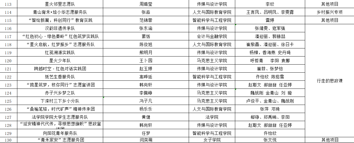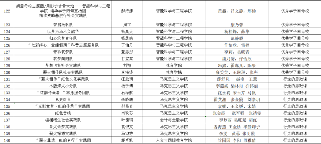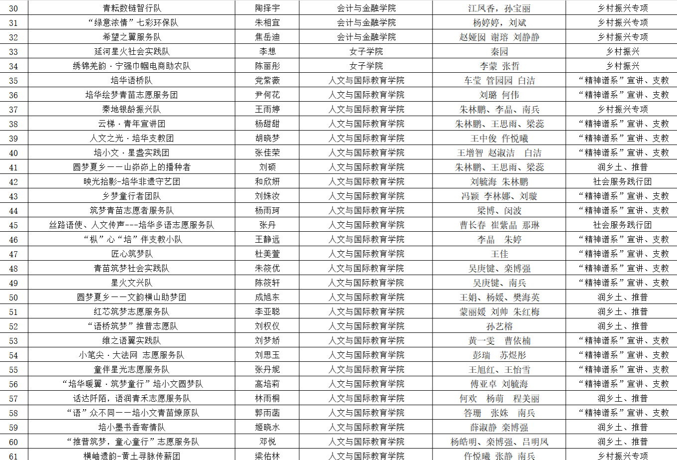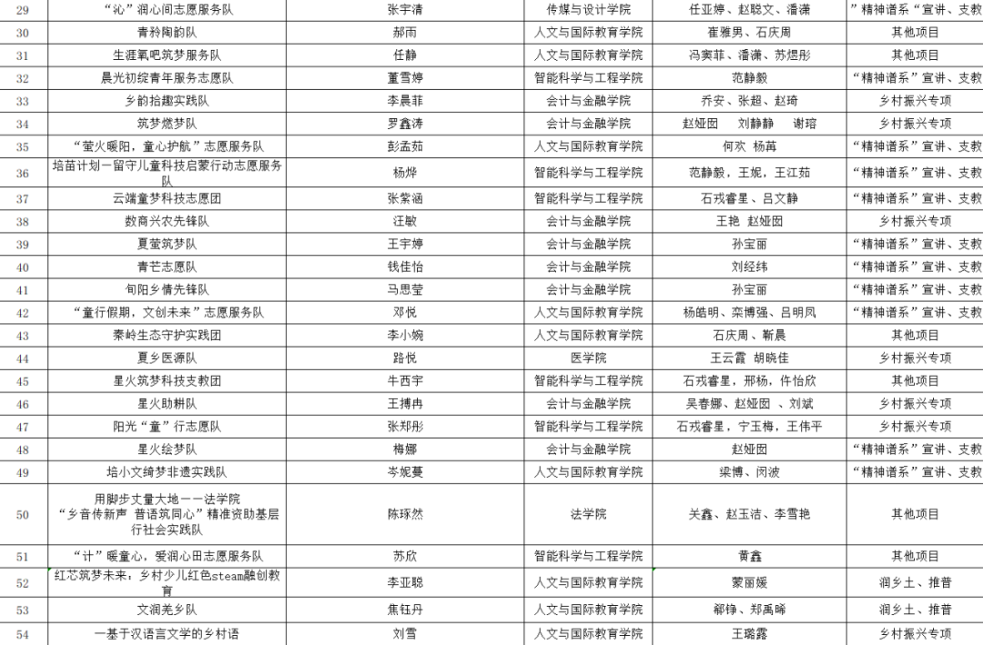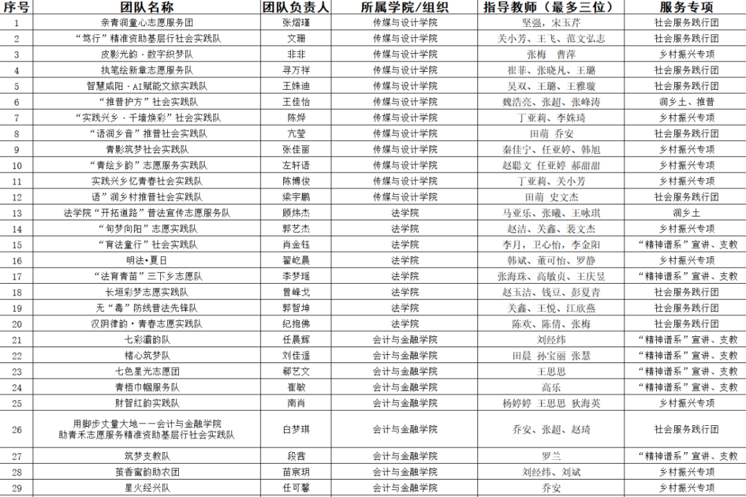 为进一步发挥共青团在高校思想政治工作中的主力军作用,引领培华青年扎根中国大地,在实践的“大思政课”中“受教育、长才干、做贡献”,2025年西安培华学院暑期“三下乡”社会实践活动共组建团队305支,经答辩审核立项、综合评审,最终确定140支重点立项团队,130支一般立项团队,现予以公示。