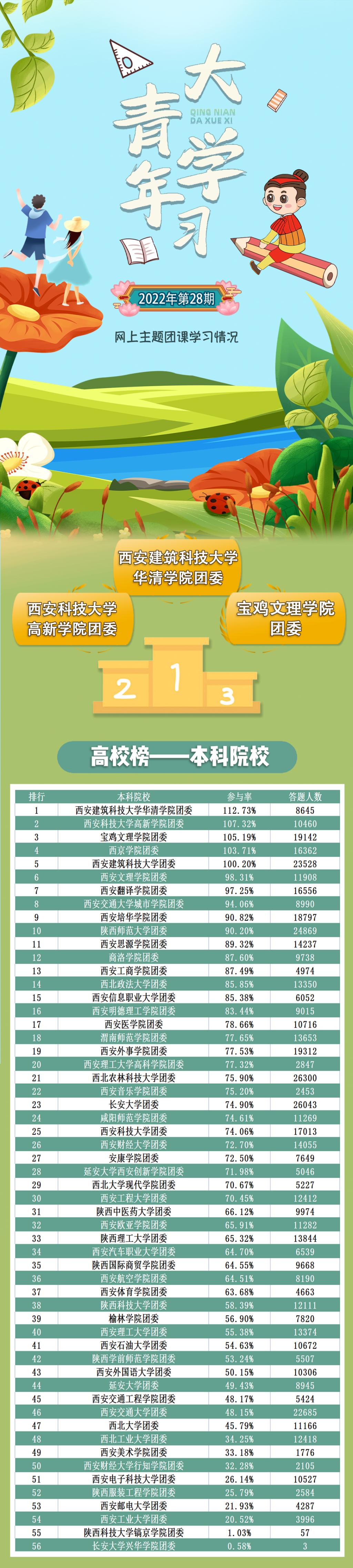 在上期的“青年大学习”中,西安培华学院团委排名第9名;参与率90.82%,答题人数18797次,各学院还需继续努力。希望各二级学院团委能更加积极广泛地动员好团员青年参与到“大学习”中,让团员青年更好地学习党的理论与主张。