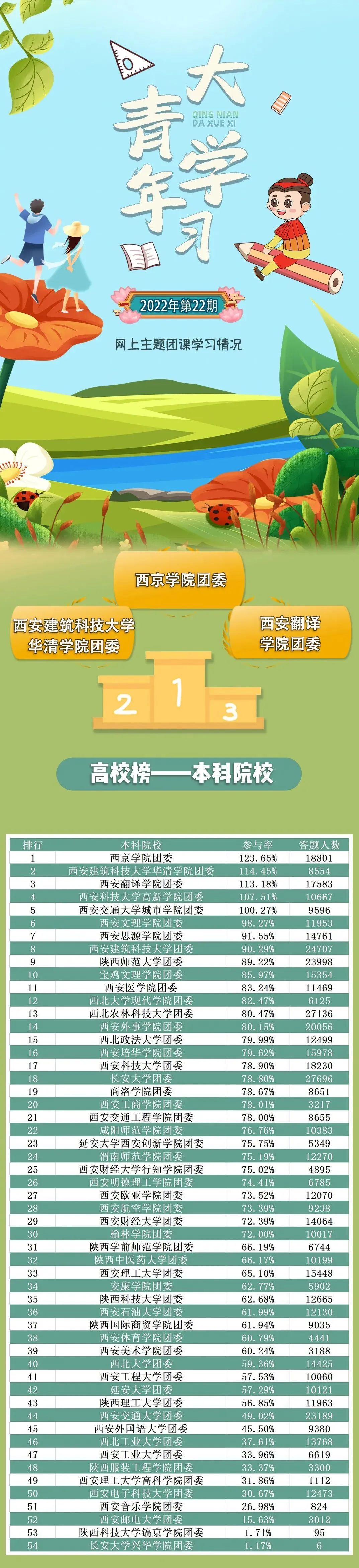 在上期的“青年大学习”中,西安培华学院团委排名第16名;参与率79.62%,答题人数15978次,各学院还需继续努力。希望各二级学院团委能更加积极广泛地动员好团员青年参与到“大学习”中,让团员青年更好地学习党的理论与主张。