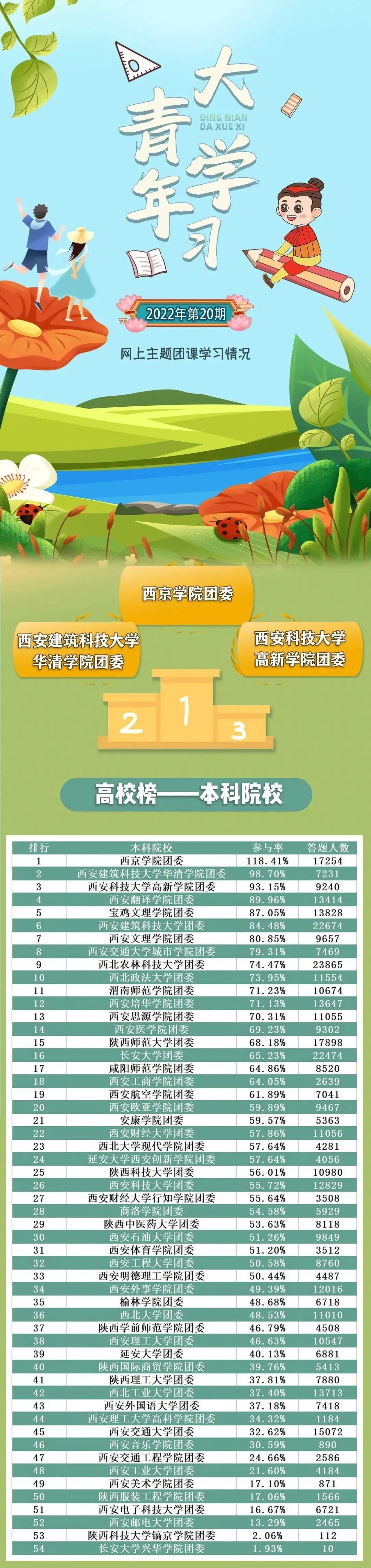 在上期的“青年大学习”中,西安培华学院团委排名第12名;参与率71.13%,答题人数13647次,各学院还需继续努力。希望各二级学院团委能更加积极广泛地动员好团员青年参与到“大学习”中,让团员青年更好地学习党的理论与主张。