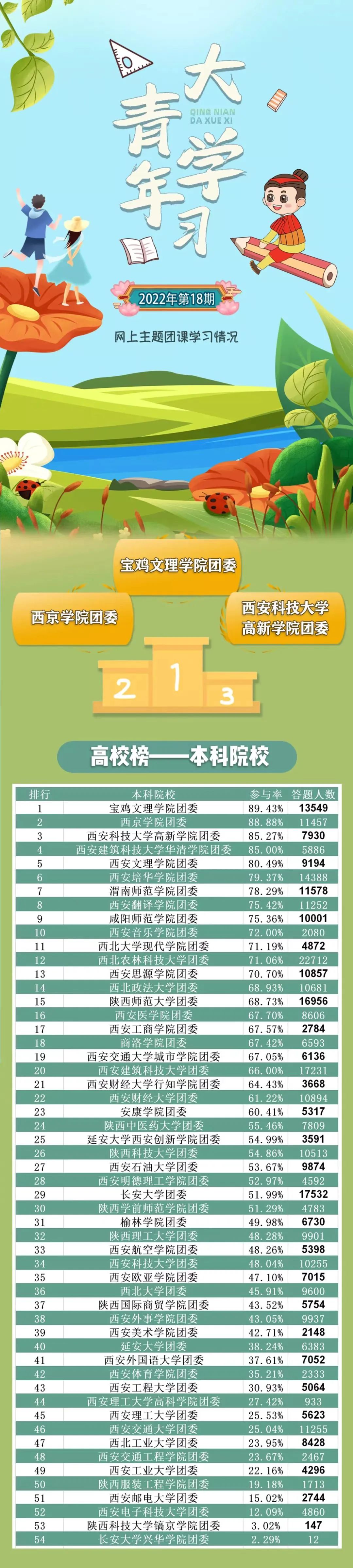 在上期的“青年大学习”中,西安培华学院团委排名第6名;参与率79.37%,答题人数14388次,各学院还需继续努力。希望各二级学院团委能更加积极广泛地动员好团员青年参与到“大学习”中,让团员青年更好地学习党的理论与主张。