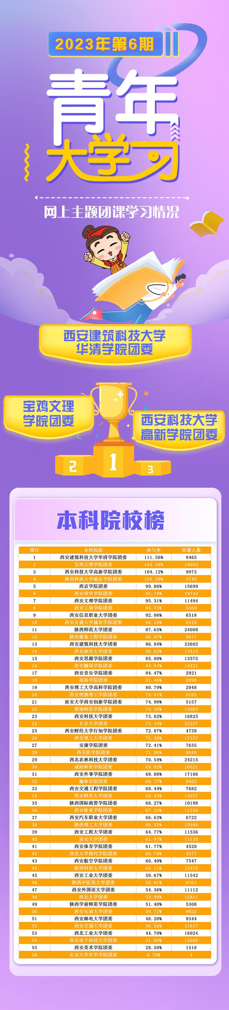 在上期的“青年大学习”中,西安培华学院团委排名第6名;参与率95.79%,答题人数19743次,各学院还需继续努力。希望各二级学院团委能更加积极广泛地动员好团员青年参与到“大学习”中,让团员青年更好地学习党的理论与主张。