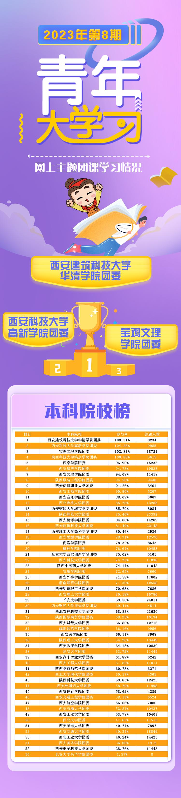 在上期的“青年大学习”中,西安培华学院团委排名第6名;参与率94.73%,答题人数19523次,各学院还需继续努力。希望各二级学院团委能更加积极广泛地动员好团员青年参与到“大学习”中,让团员青年更好地学习党的理论与主张。