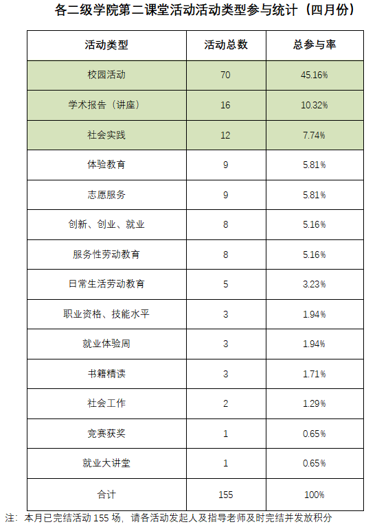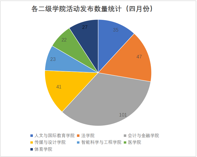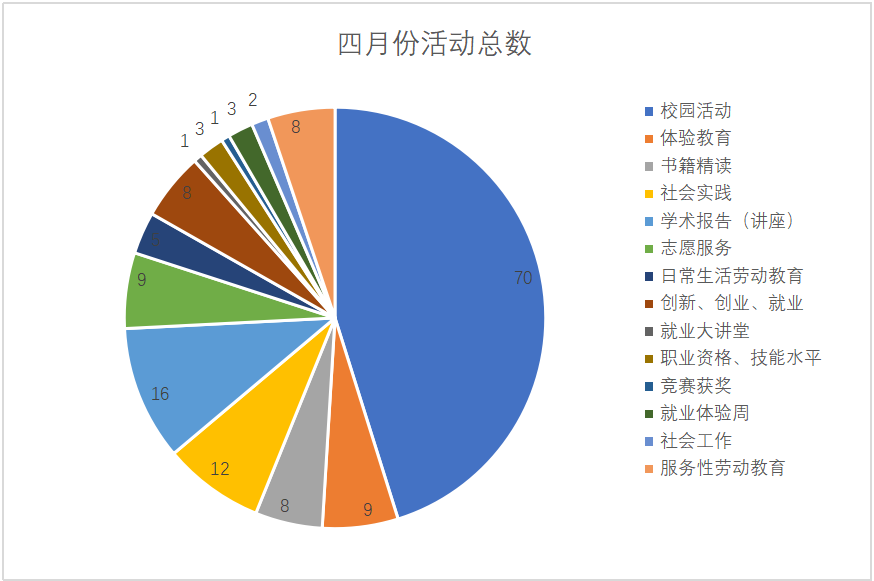 如下表所示,四月份开展的活动中校园活动、学术报告(讲座)、社会实践类活动占比较高。