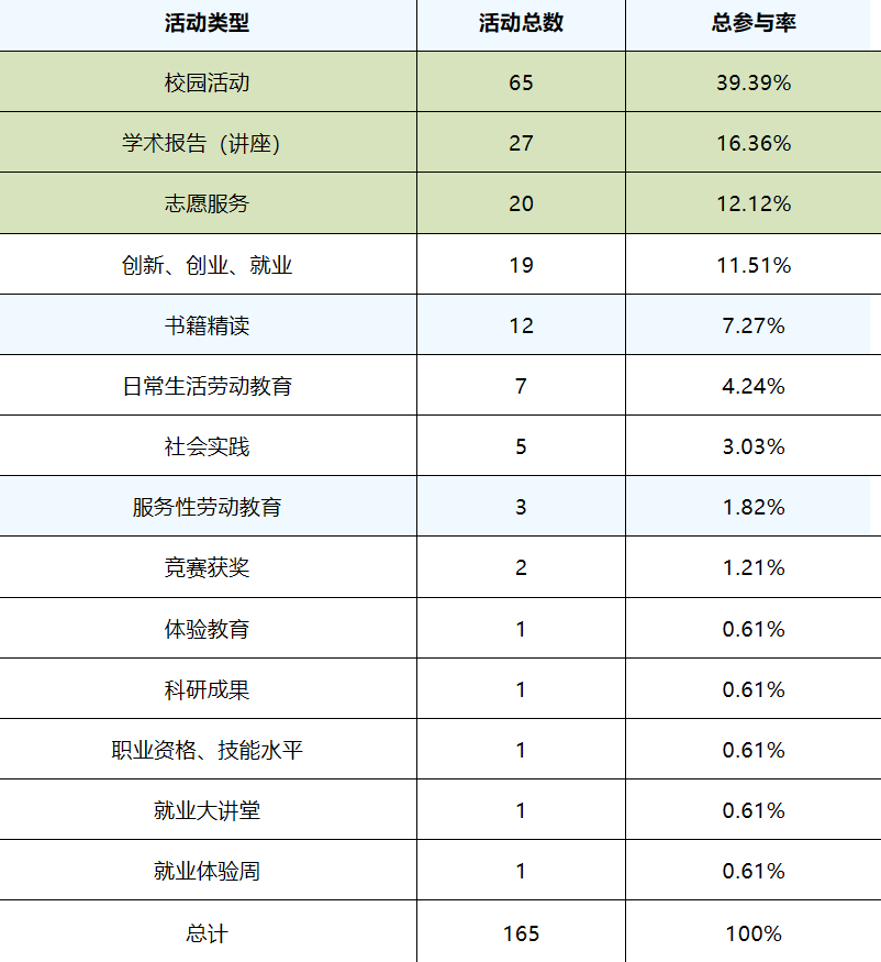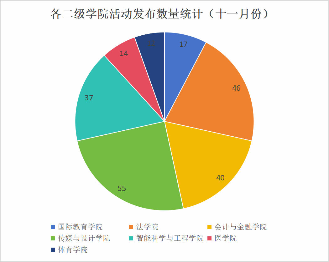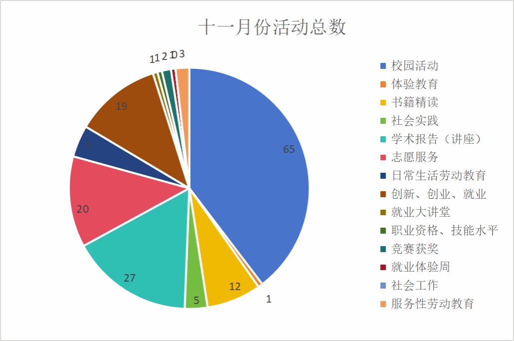 如下表格数据显示,十一月份开展的活动中校园生活、学术报告、体验教育活动占比较高