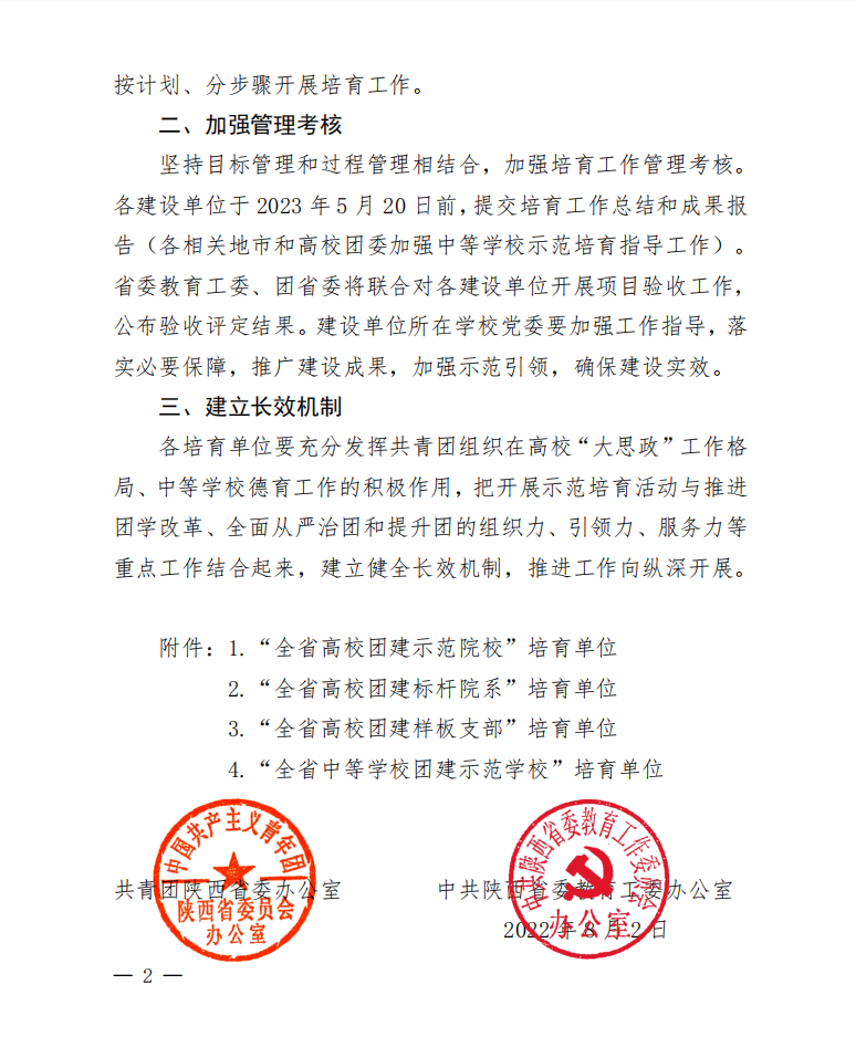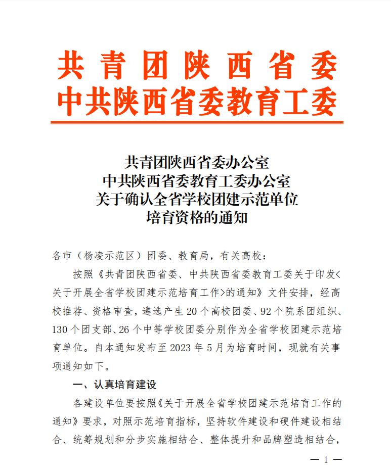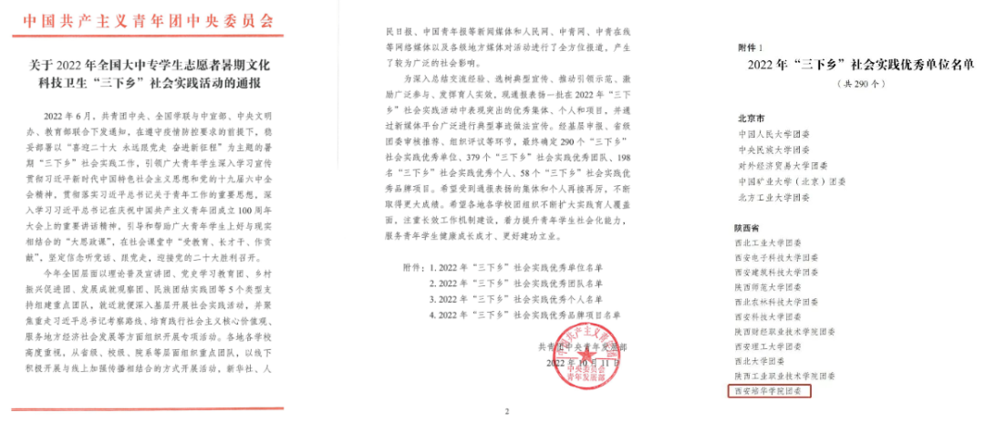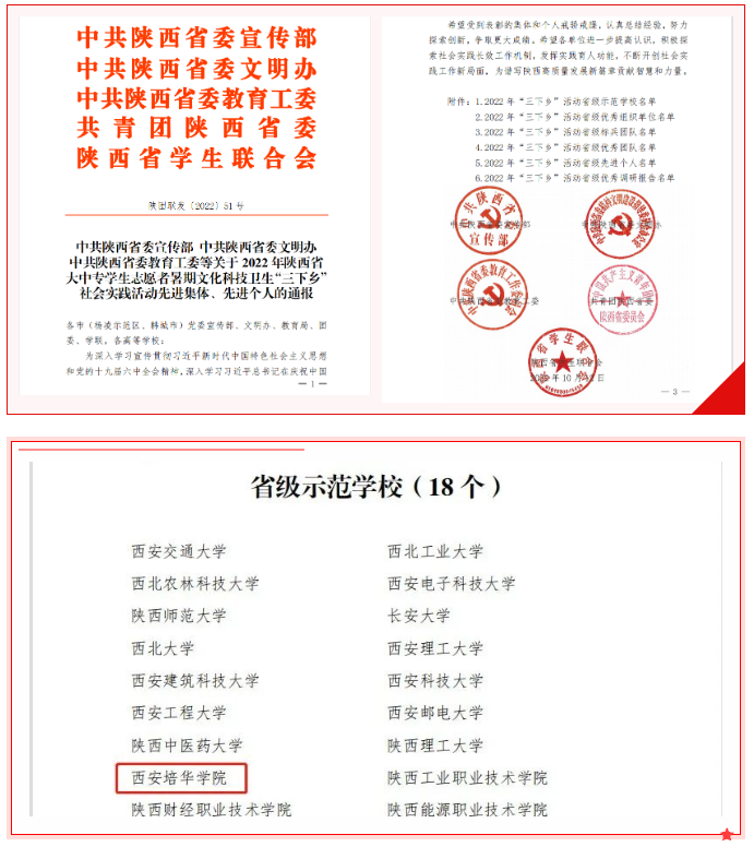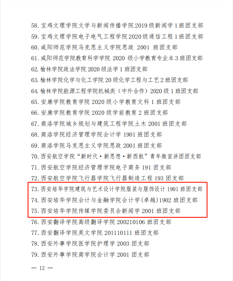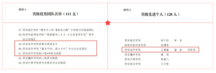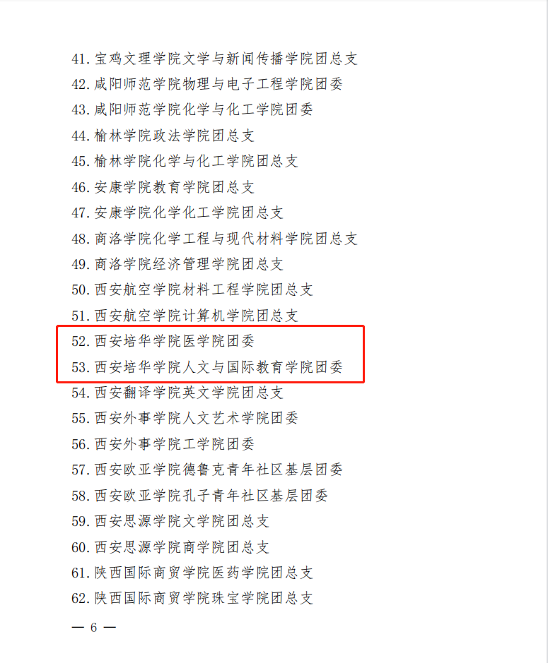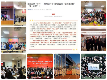 新闻学专业2019级2班团支部、会计学(卓越)2102团支部、新闻学2001团支部、护理学2004团支部、电子信息工程2021团支部、汉语言文学2108团支部等6个团支部入选陕西高校“活力团支部”展示序列;我校旭日法律协会、药学创新创业社、魔术协会、沐华艺术工坊、大学生支教协会等5家社团入选陕西高校“活力社团”展示序列。