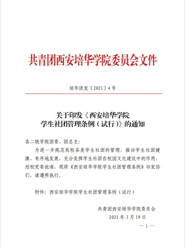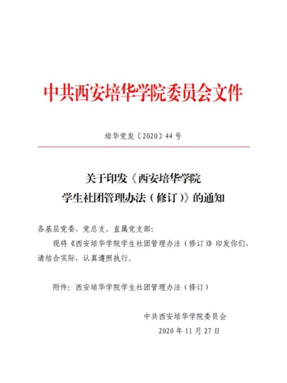 印发《西安培华学院社团管理办法》。同时修订了《西安培华学院社团管理实施细则》、《西安培华学院社团团组织条例》《西安培华学院社团星级评定》等文件,进一步推动社团发展科学化、规范化。