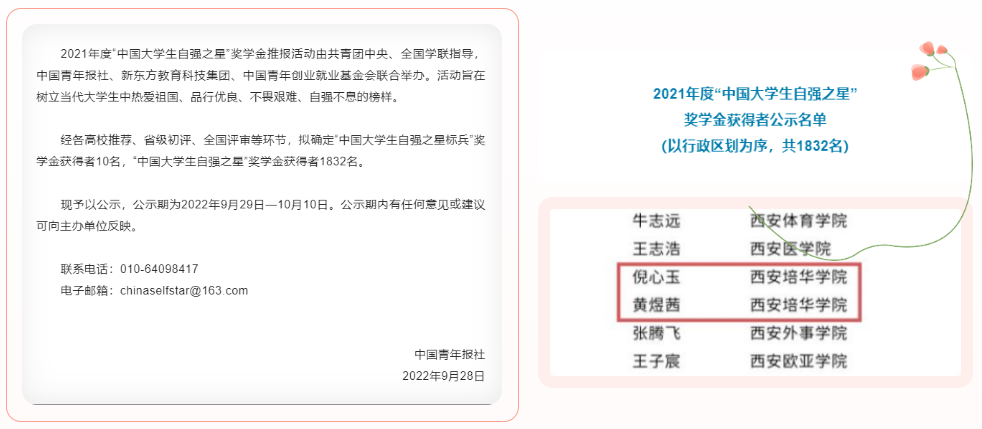 我校传媒学院2019级新闻学专业倪新玉同学、人文与国际教育学院2019级汉语专业黄煜茜同学,获评全国“大学生自强之星”和陕西省“大学生自强之星标兵”荣誉称号。