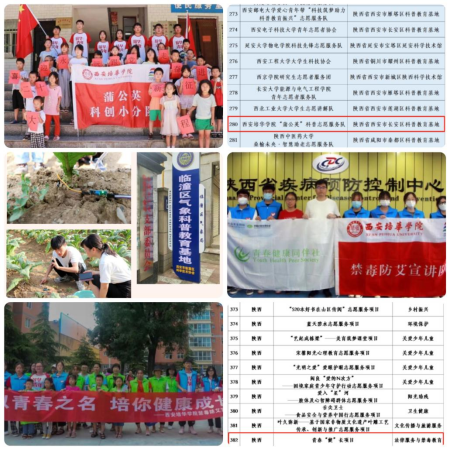 我校志愿服务工作取得新突破:2022年,我校组织申报的陕西省“大公益”体系研究项目顺利结项;“青春‘健’长”项目成功入围第六届中国青年志愿服务项目大赛国家级铜奖;蒲公英科普志愿服务队入选全国大学生科技志愿服务示范团队。同时,我校“以青春之名‘培’你健康成长”项目荣获2022年度陕西省“争做禁毒先锋守‘尉’无毒家园”青少年法治禁毒宣传教育专项实践活动资助,并获批项目金额5000元。