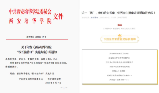 先后发布了《西安培华学院关于开展“校长接待日”工作的实施方案》《西安培华学院领导干部联系学生班级实施办法(试行)》(党发【2022】16号),开展“大学生权益服务月”“我为同学做件事-留言信箱”等活动,共收集提案800余份,广泛征集同学们在生活、学习等方面的问题,及时对接学校相关部门及时解决,回应学生诉求