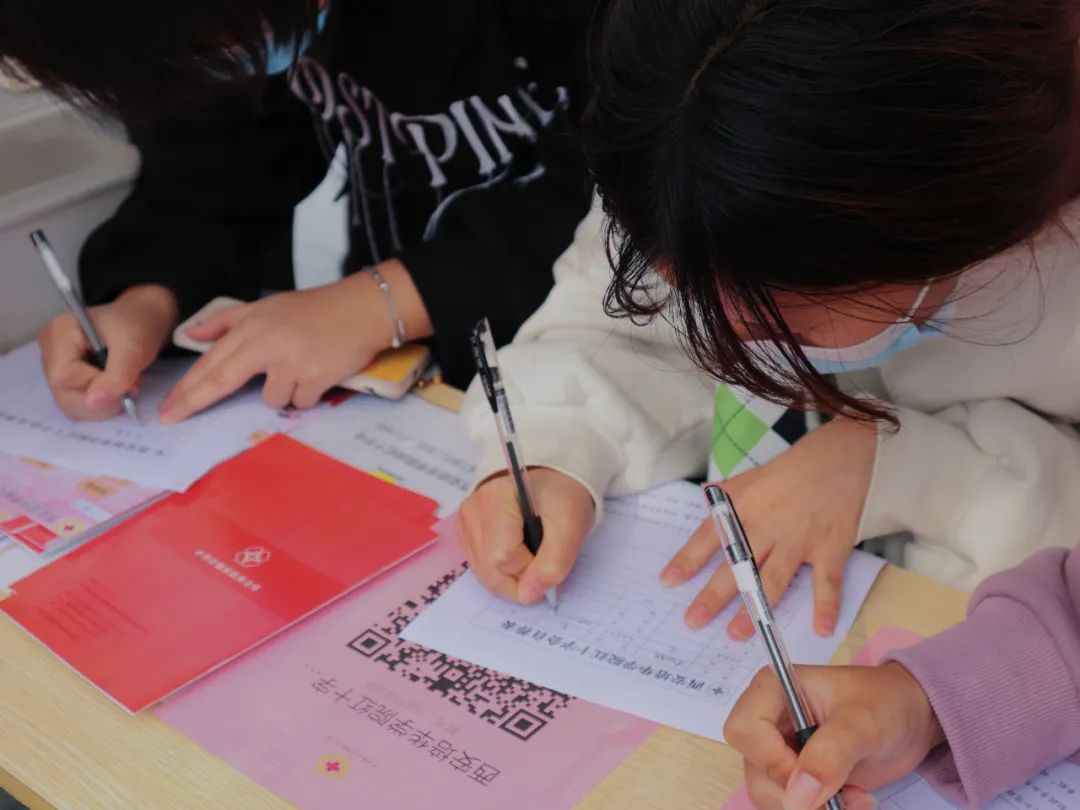 纳新现场,红小十在综合楼西广场进行定点宣传,积极主动的向萌新们介绍培华红会的特色活动和部门职责,热情解答萌新们提出的各种疑问,细心讲解指导萌新进行填表。