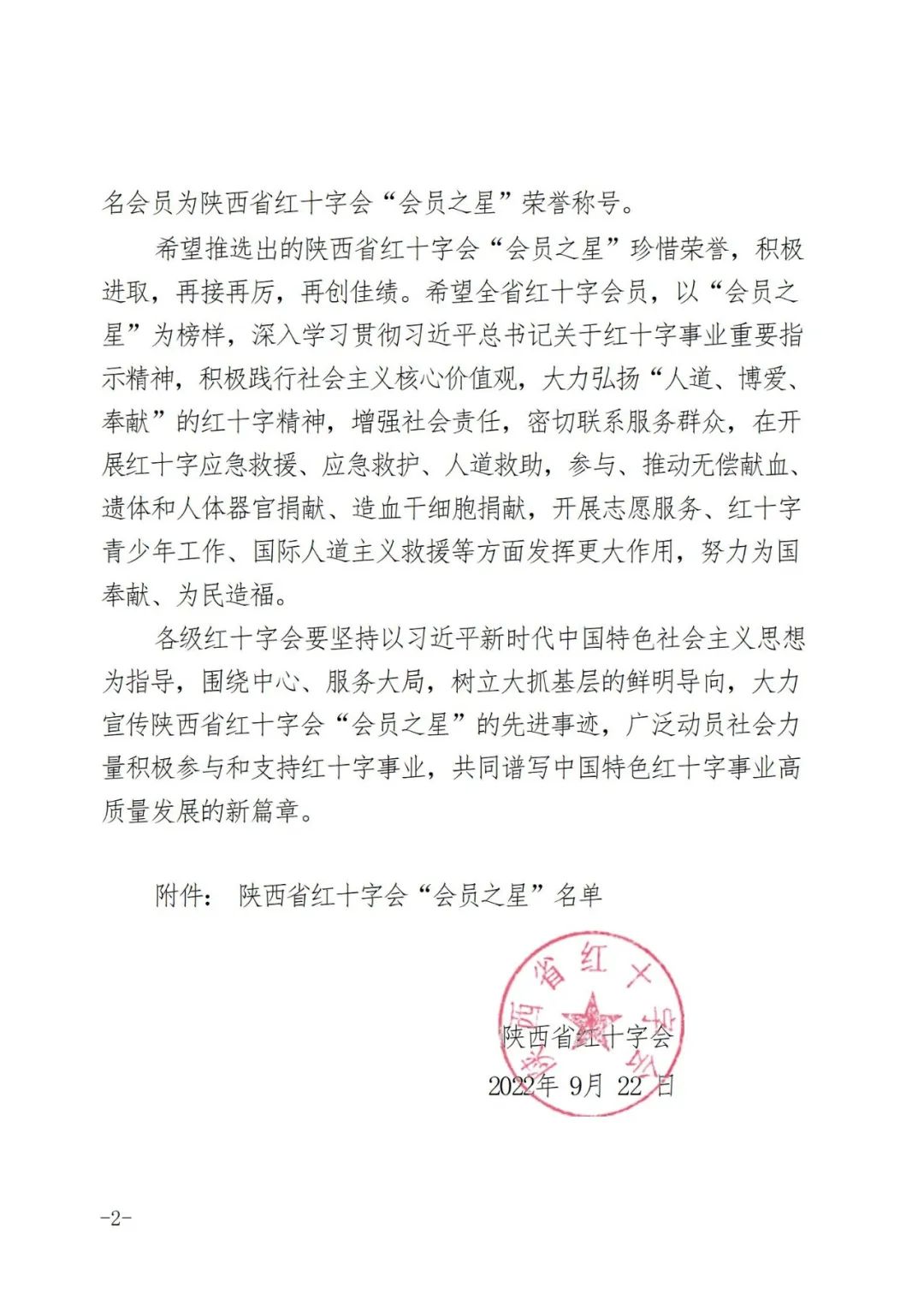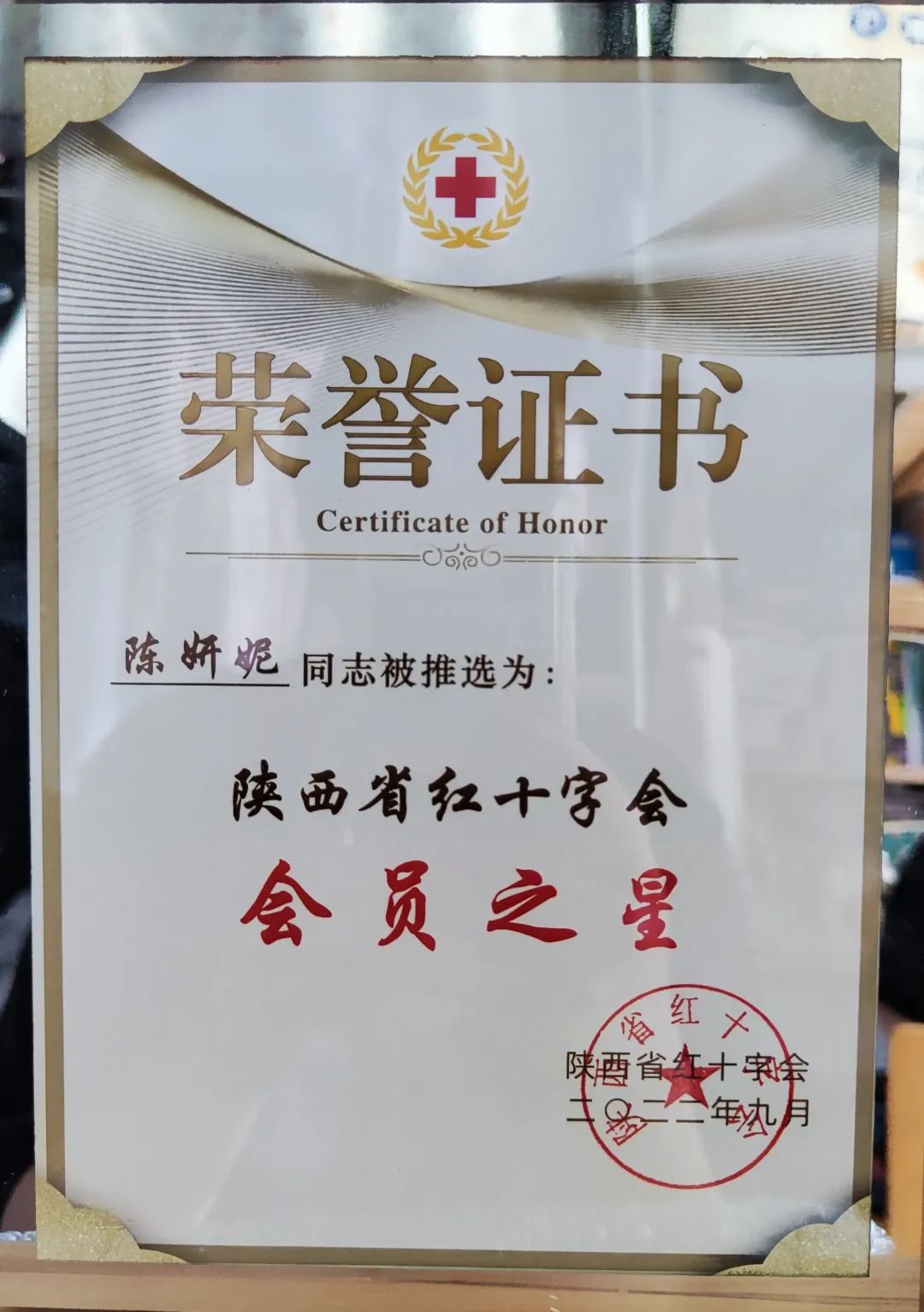 2022年9月22日,陕西省红十字会发布《陕西省红十字会关于表彰陕西省红十字会之星的决定》(陕红发[2022]41号)中,西安培华学院红十字会学生分会成员陈妍妮荣获陕西省红十字“会员之星”荣誉称号。