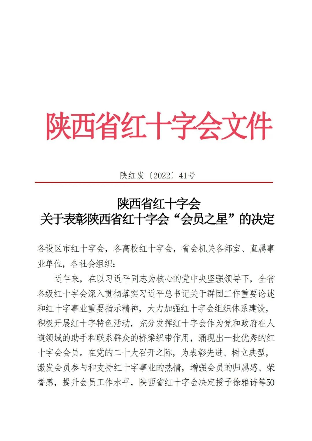 近日,陕西省红十字会“会员之星”推选活动揭晓,经过各级推选,陕西省共50名会员上榜,我校红十字学生分会干部陈妍妮名列其中。
