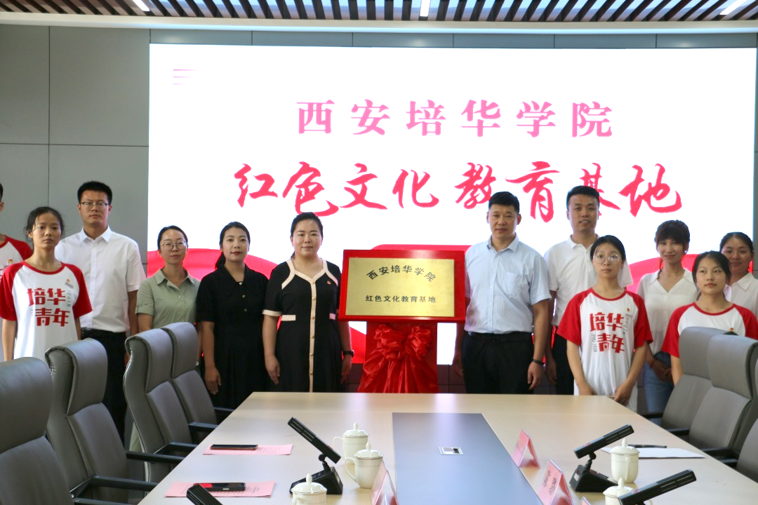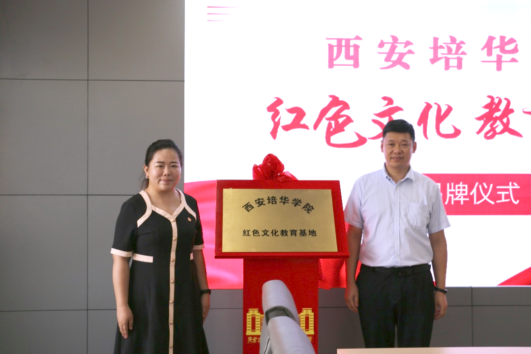 西安培华学院党委委员、党委学工部部长蔡亮和团区委书记刘仁婕共同为“红色文化教育基地”揭牌。