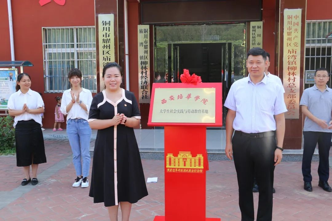 西安培华学院党委委员、学工部部长蔡亮和团区委书记刘仁婕共同为“大学生社会实践与劳动教育基地”揭牌。