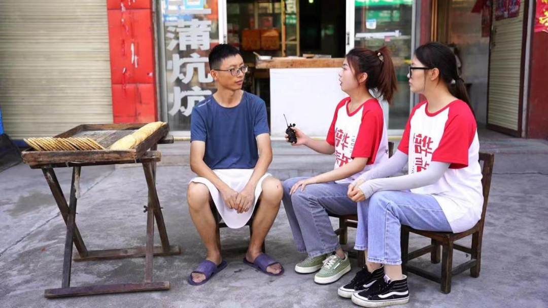 图为西安培华学院学生拍摄传统炕炕馍制作