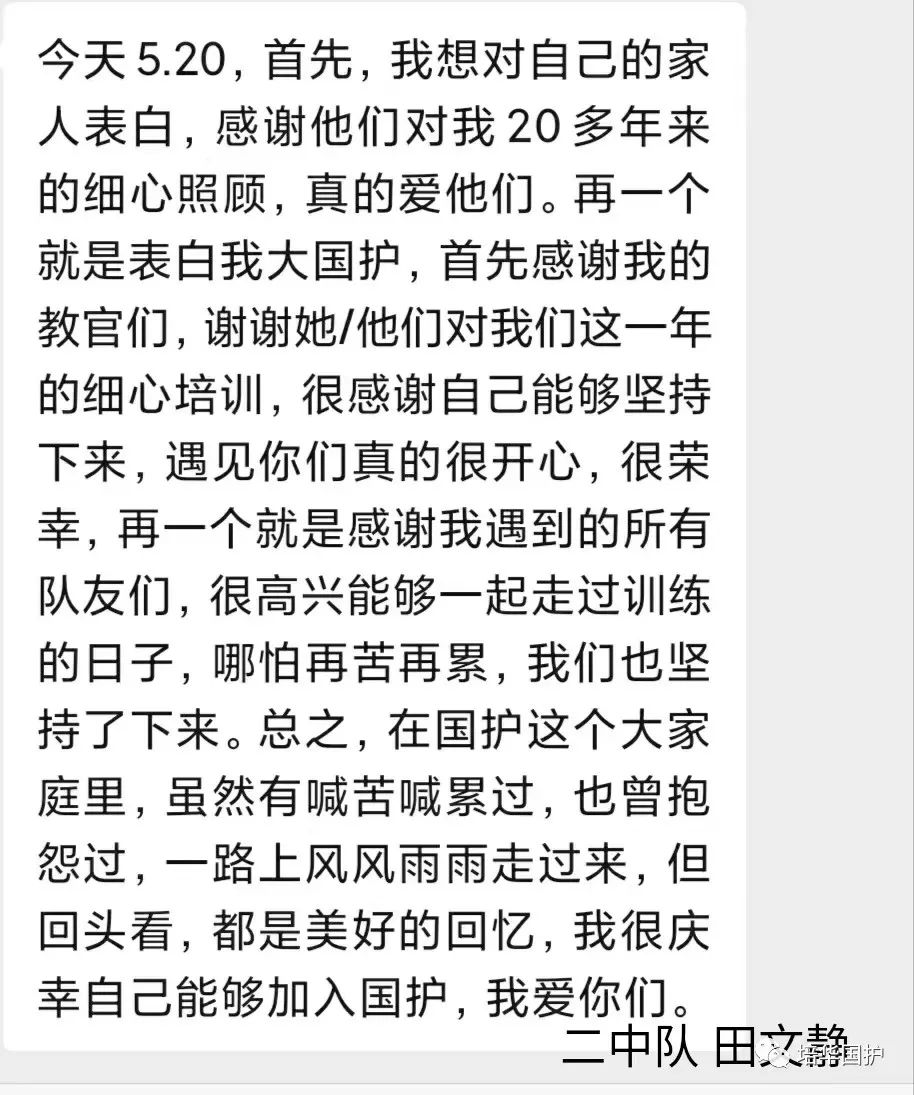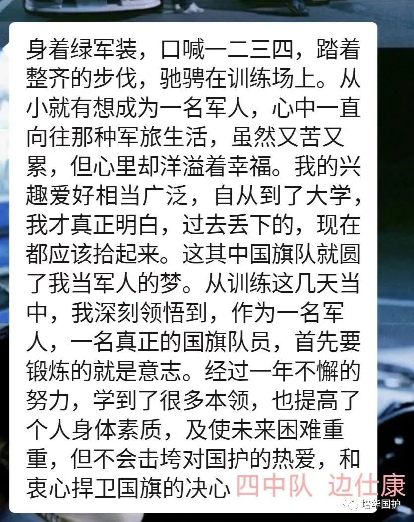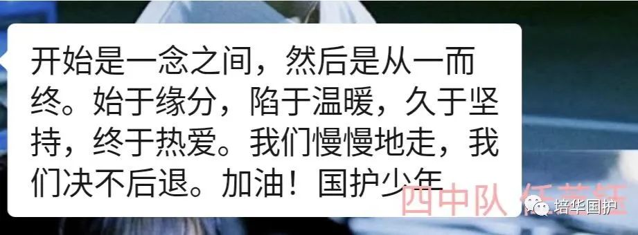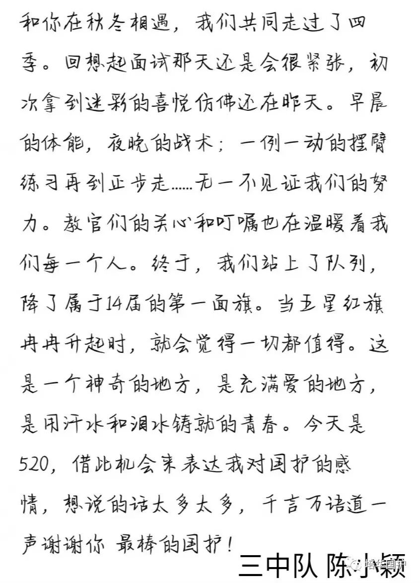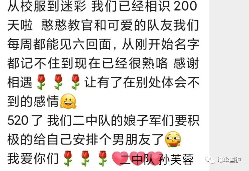 在国护队训练的日子是在学生时期生活中最浓墨重彩的一笔,也会是日后念念不忘的日子。国护的教官们用自己的爱心悉心呵护着小十四们,关注你的一举一动,留心你的一瞥一笑,倾听你的心声需要。520我爱你国护,我爱这里的每一位少年。少一些功利主义的追求,多一些不知为何的坚持,是我们一声国护,一生国护,人人不变的传承。