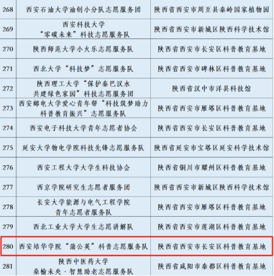 2022年10月,“蒲公英”科普志愿服务队(智能科学与信息工程学院申报)经过层层选拔,入选全国大学生科技志愿服务示范团队,这也是我校科普志愿服务在国家层面上零突破,该团队以西安市临潼区气象科普教育基地为主阵地,以“智能+信息+气象”为抓手,以学习及实践能力提升为总目标,开展志愿学习及实践服务相关活动。