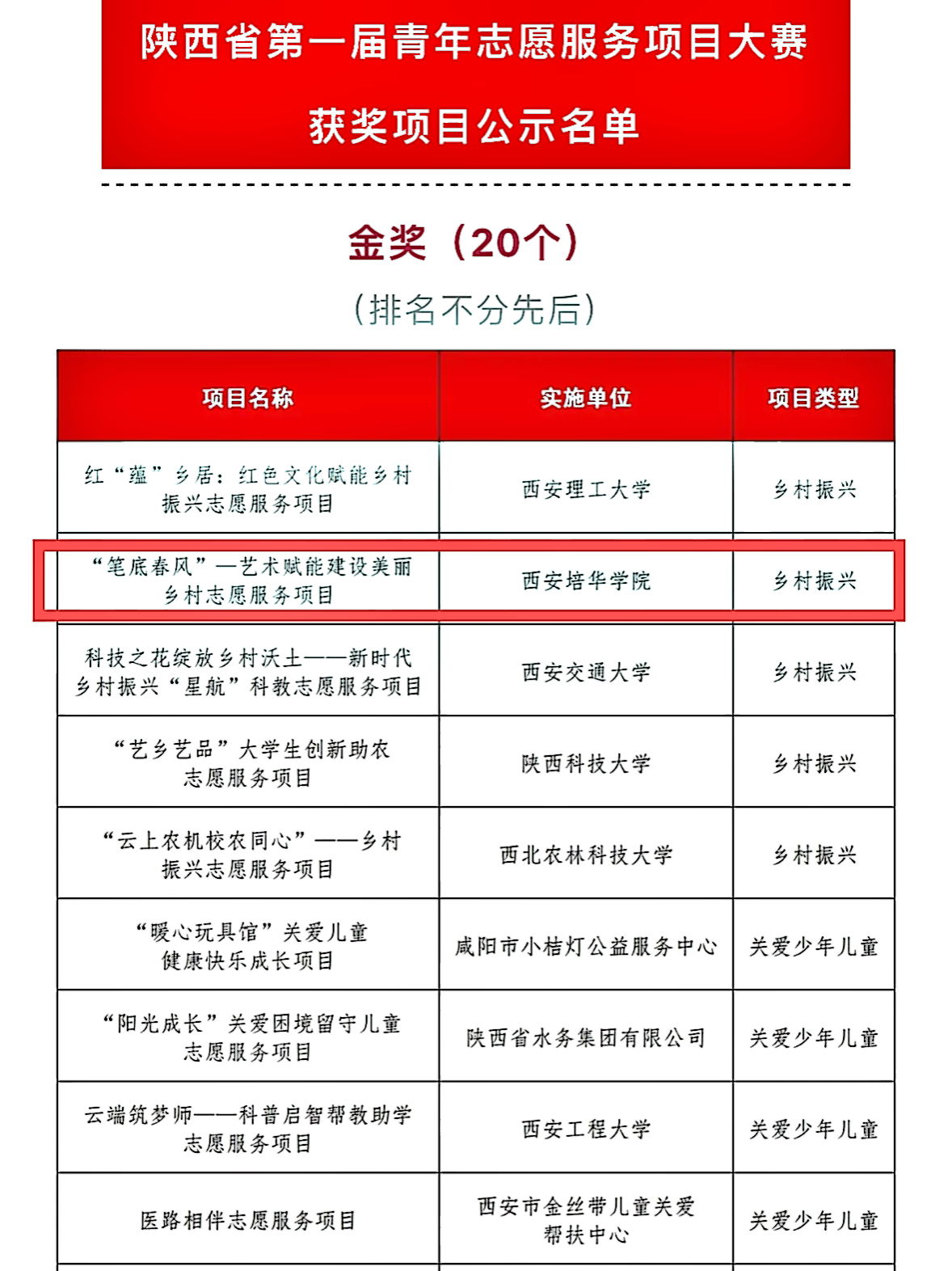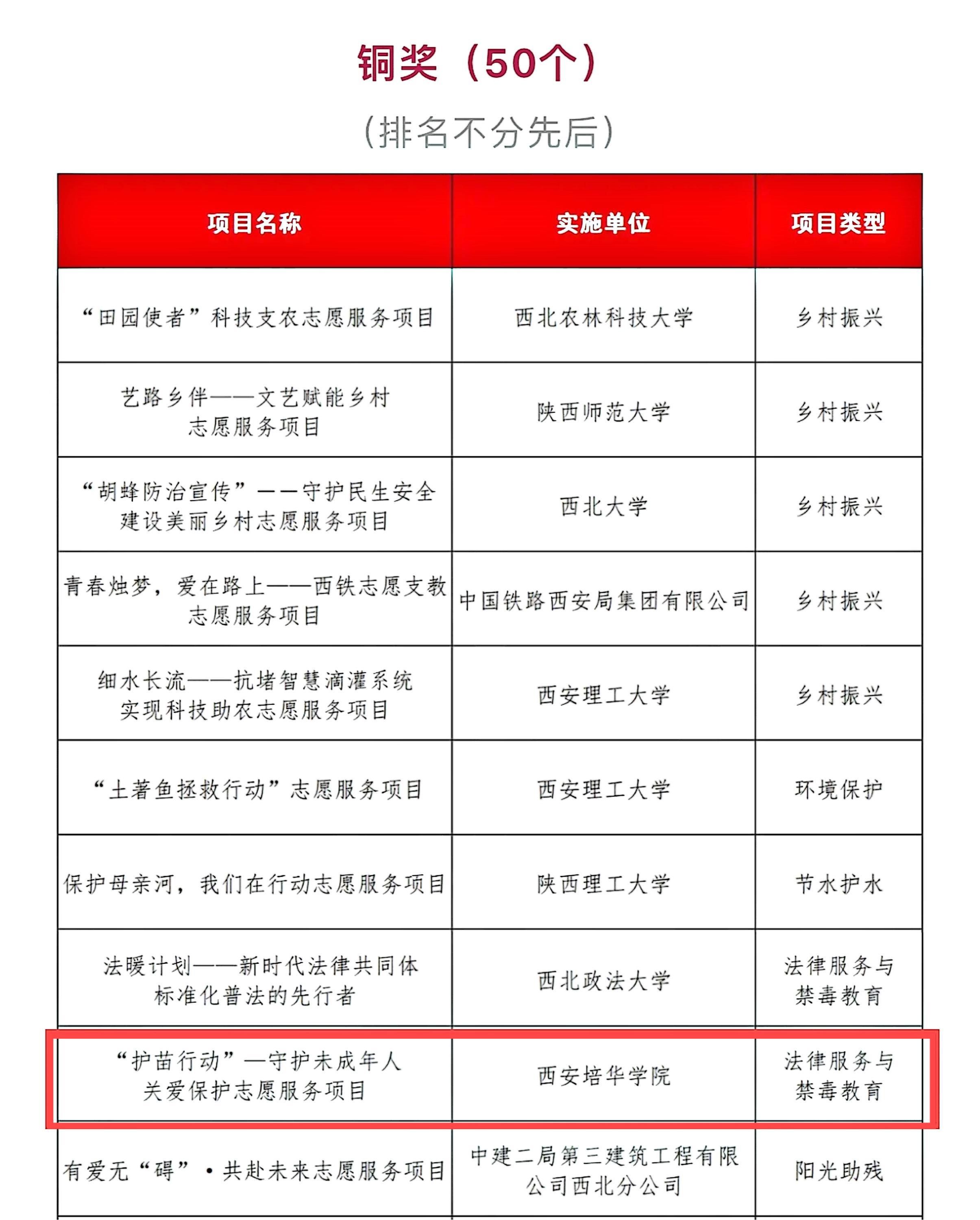 经项目申报、省赛初评、省赛终评、团省委审定,获奖项目名单进行公示,我校荣获一金一铜的好成绩。其中,“笔底春风”-艺术赋能建设美丽乡村志愿服务项目荣获金奖,“护苗行动”-守护未成年人关爱保护志愿服务项目荣获铜奖