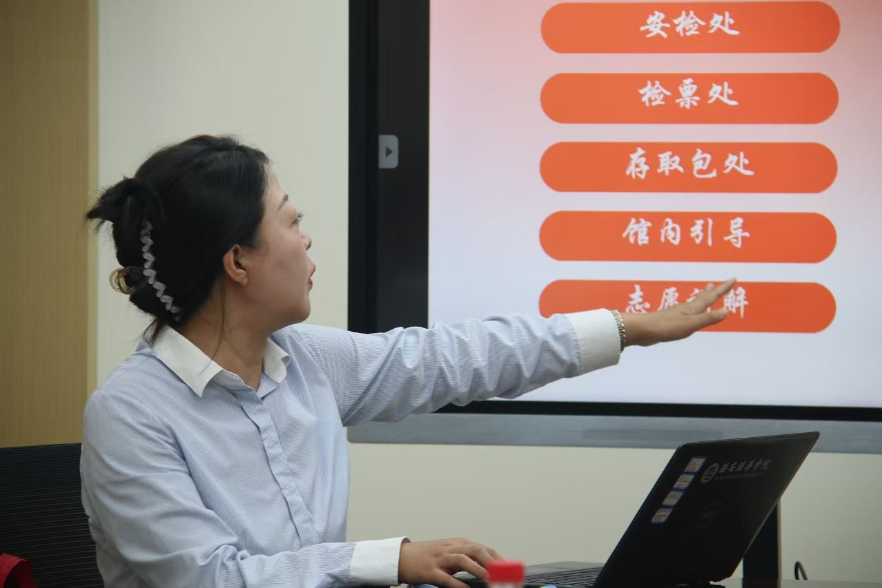 会上,人文与国际教育学院团委书记朱林鹏汇报学院志愿服务工作及文博志愿者招募选拔情况,学院依托中文系,将志愿服务与专业实践相结合,利用西安市悠久文化历史背景,扩展学生专业学习外延,用志愿服务搭建起志愿者与游客了解西安历史文化的桥梁,用热情文明的服务态度提升游客体验,为擦亮西安旅游金名片,助力西安市博物馆事业服务高质量发展发挥积极作用。