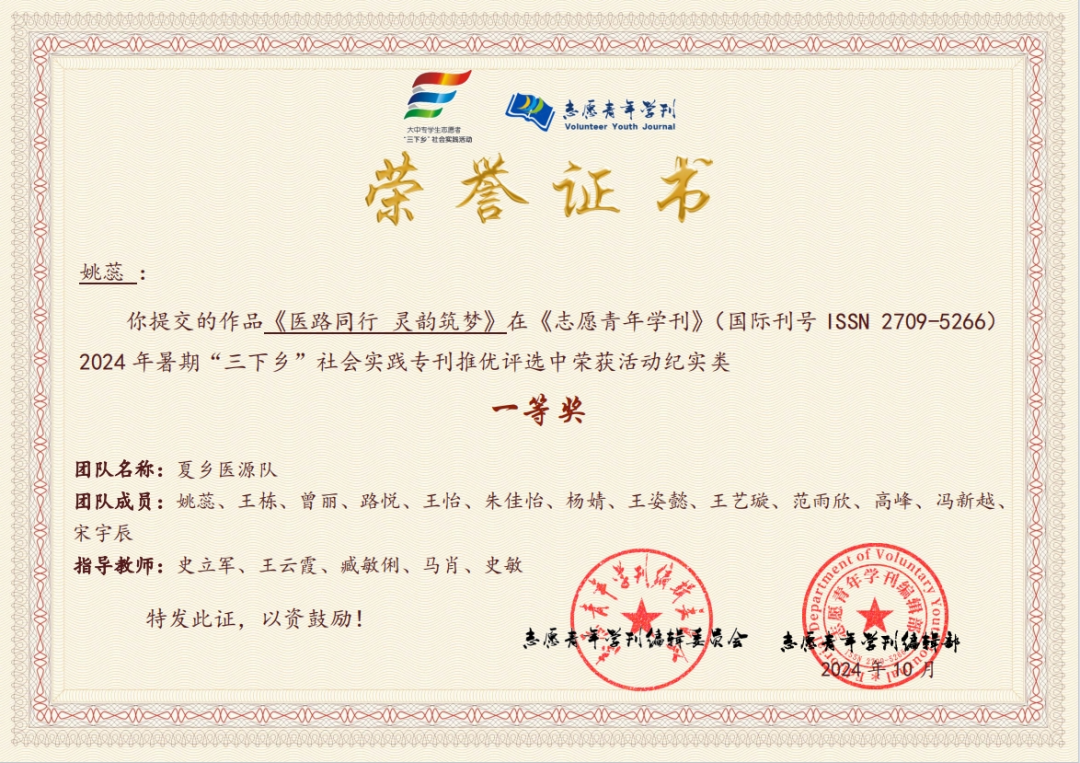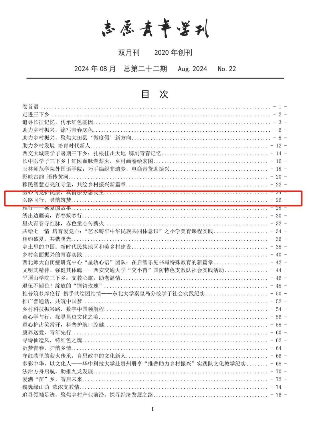 我校医学院“夏乡医源”社会实践队投稿被《志愿青年学刊》(国际标准刊号为ISSN 2709-5266)编辑部开展的2024年暑期“三下乡”社会实践专刊(上辑-活动纪实)收录。