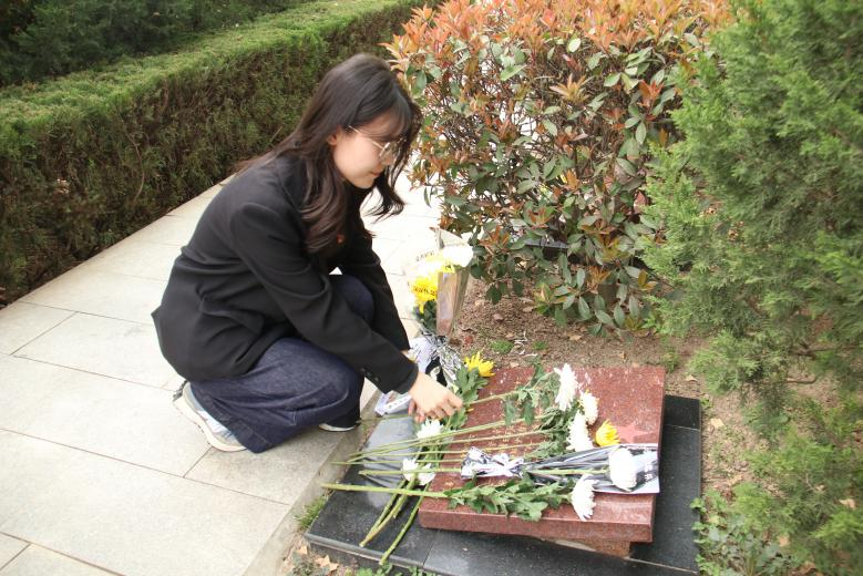瞻仰烈士墓区环节,师生手持白菊,逐一驻足于先烈墓碑前,轻拭浮尘、敬献鲜花。培华青年以指尖温度对话英雄故事,我们看见:红色基因从未褪色,它正扎根于培华人的内心,热烈而又真挚,生长出最鲜活的姿态。这个清明,培华青年用青春体温焐热了历史,而历史,终将把未来交给这样的青春。
