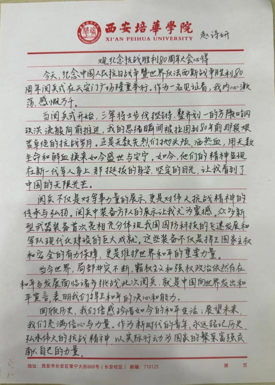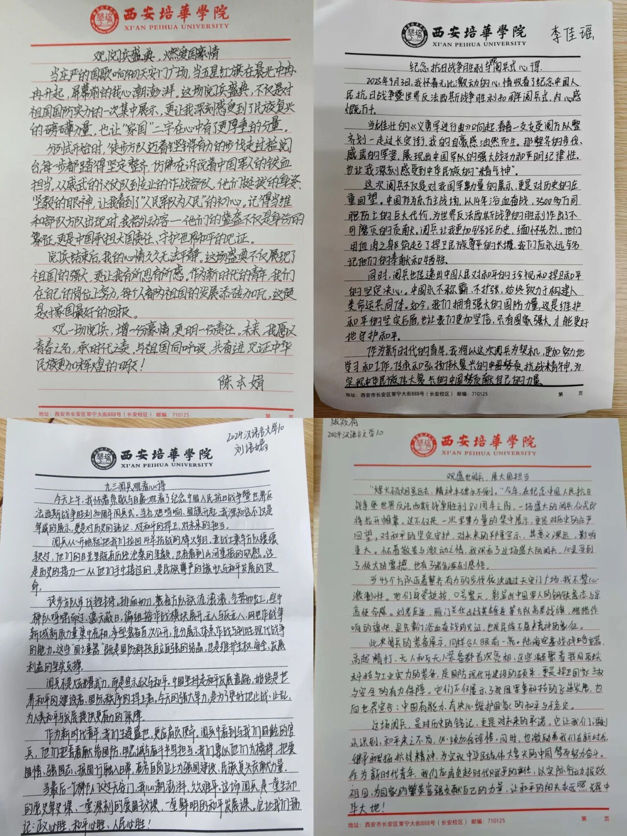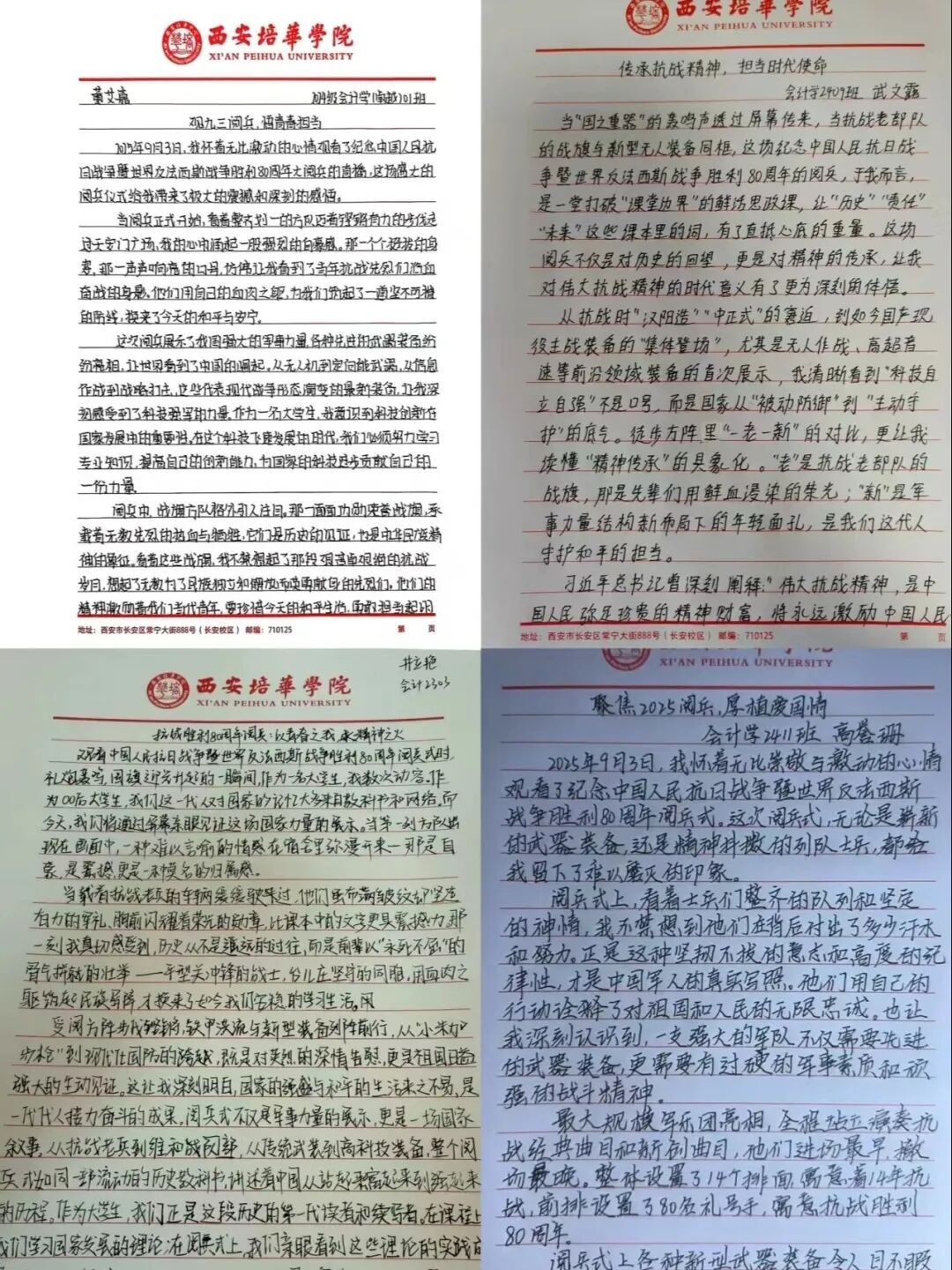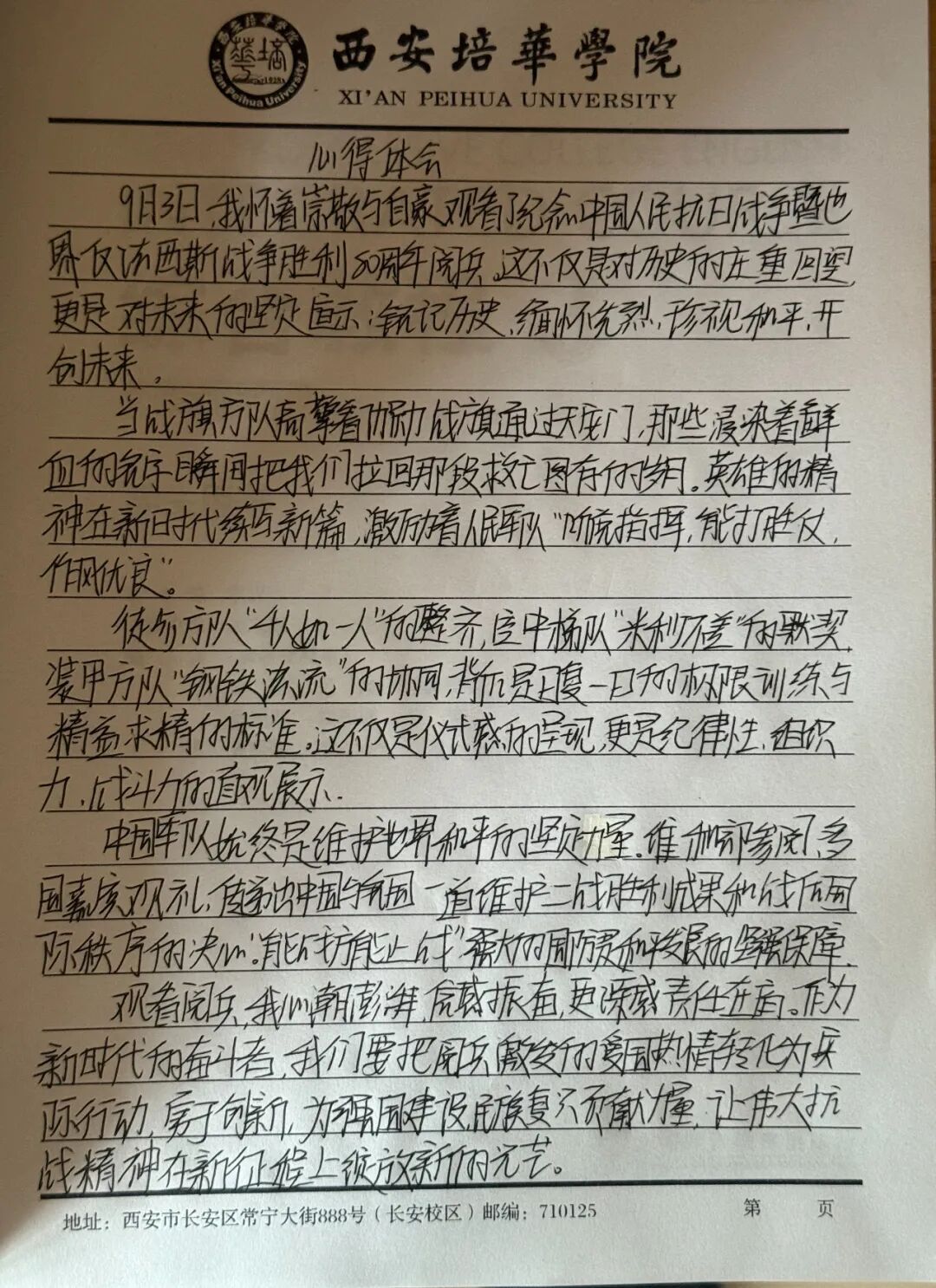 铭记历史、珍惜和平、努力奋斗,是我们从这场阅兵中得到的最大启示。此次活动作为深化爱国主义教育的重要实践,既带领师生重温抗战历史,也进一步凝聚了青春力量。校团委将继续用好这些宝贵的教育契机,把爱国主义的种子播撒到日常活动中去,让它生根发芽。希望培华青年能把这次的感动和收获,变成日常学习中的认真努力、校园生活中的团结互助,一起为培华园添彩,让抗战精神从历史记忆转化为青春行动的动能。