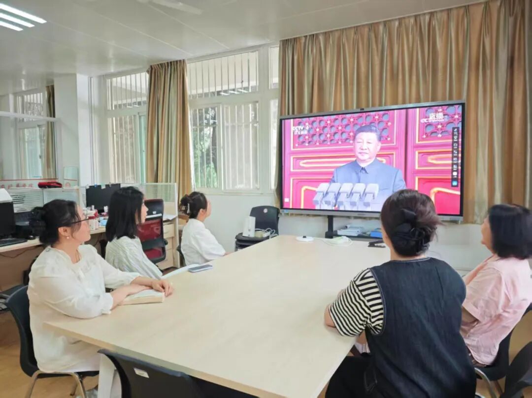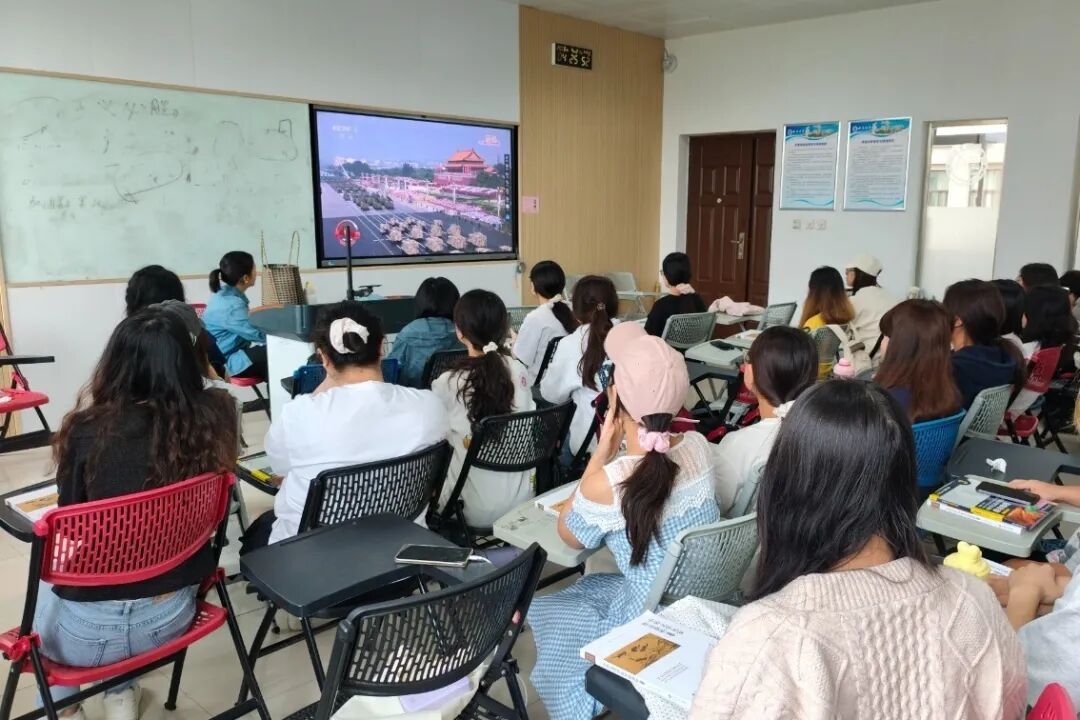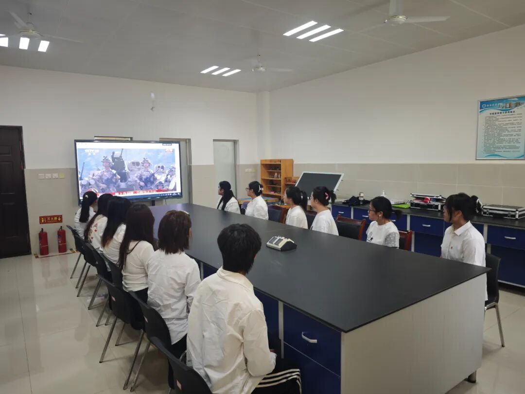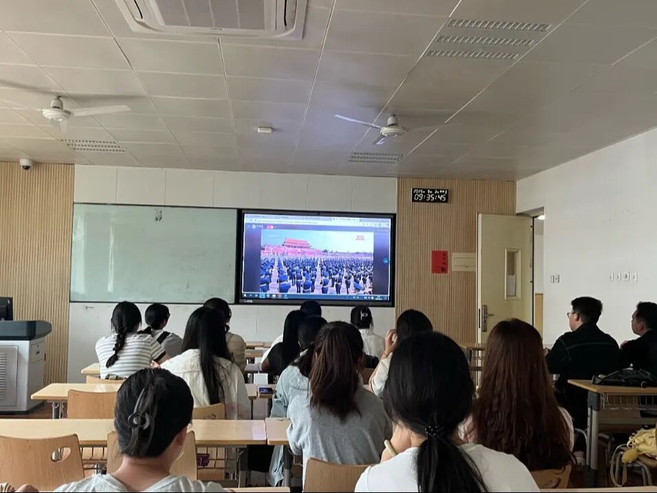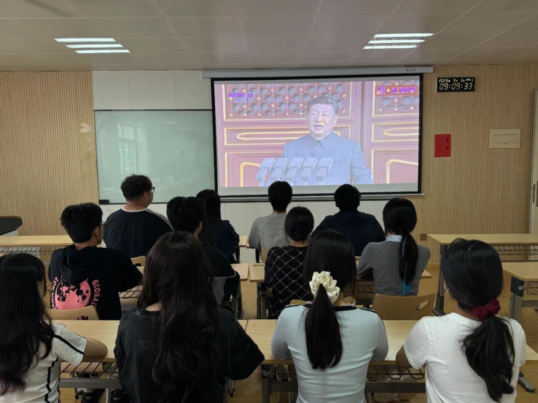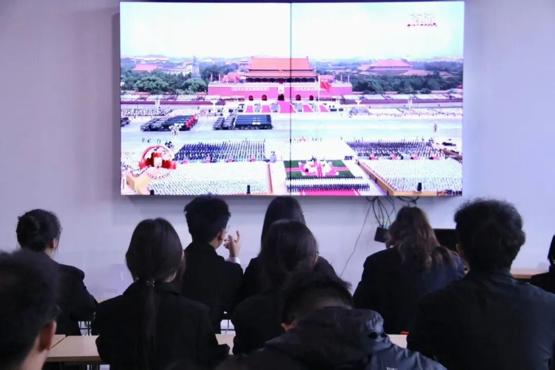 “以吾辈之青春,捍卫盛世之中华”,校团委在恒友楼统一设置主集中收看点,各组织学生干部、团员代表紧盯屏幕,全神贯注的目光里流露着敬畏与赞叹。从国旗护卫队没有音乐伴奏、只能自己踩鼓点,到礼炮轰鸣震撼人心,再到仪仗方队第一个走过天安门广场接受检阅,英姿飒爽显青春担当,气势震山河,每一个振奋人心的瞬间,同学们情不自禁地鼓掌,现场气氛非常热烈。