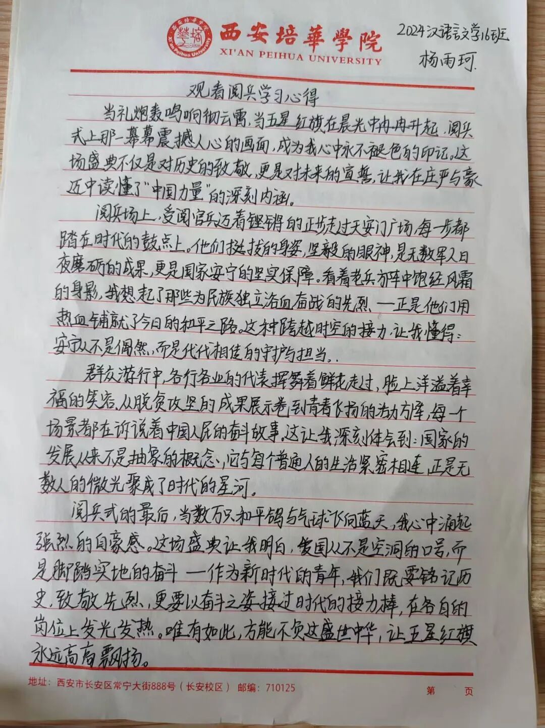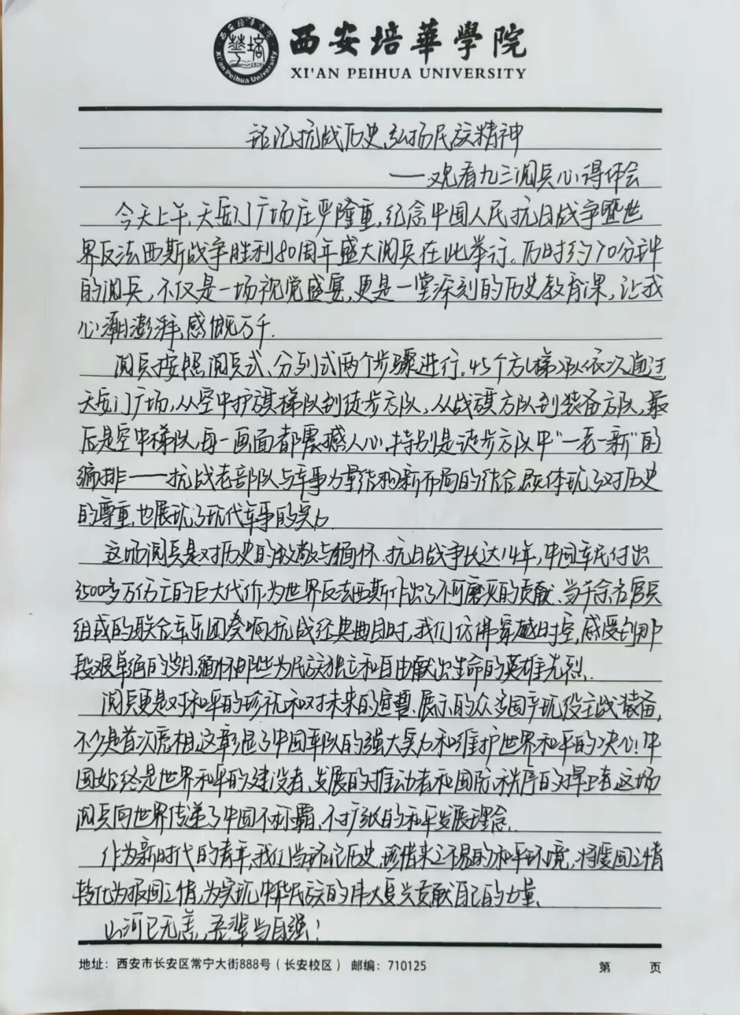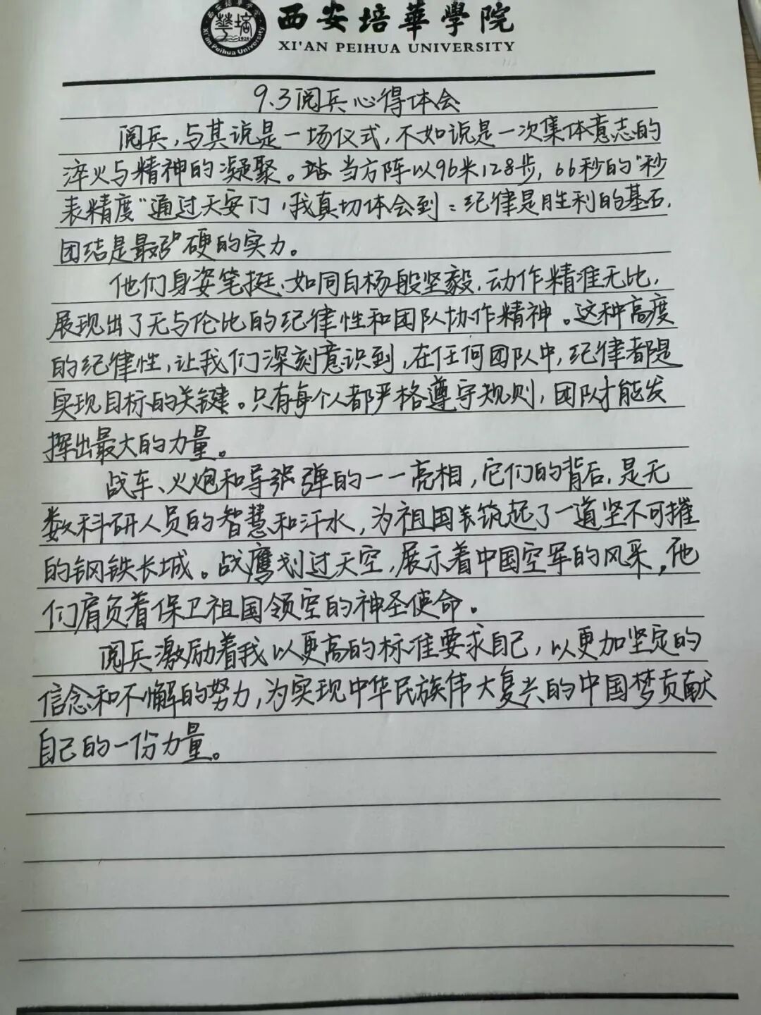 习近平总书记强调要弘扬伟大抗战精神,为实现中华民族伟大复兴而奋斗。在这次意义非凡的活动中,我不仅收获了宝贵的经验,也深刻体会到了团队协作和奉献精神的重要性。此次阅兵展现的队伍风采、军人形象。作为学校国旗护卫队队长,我需要不断丰富精神内涵、汲取先进经验,将目之所望,转变为行动所向。整个阅兵观看中,最让我难忘的是队员们的坚守和付出。我们很多队员都深受感触,从训练场到阅兵式,需要提前很久出发,才能到达“目的地”,但没有一个队员抱怨。阅兵,是我人生中一段难忘的经历。它让我更加深刻地理解了责任、奉献和团队协作的意义。在未来的生活和工作中,我将继续发扬这种精神,为社会贡献自己的力量。