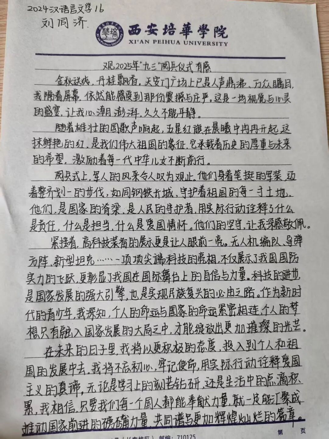 这场阅兵对我而言不仅是一场视觉盛宴,更是一堂深刻的思想政治教育课。阅兵场上,功勋战旗迎风飘扬,新型武器装备相继亮相,展示我国国防现代化的辉煌成就。从“没有枪没有炮,敌人给我们造”到所有受阅武器装备都是国产现役主战装备,中国军队无论在体系还是装备上早已今非昔比。这种跨越式发展令我热血沸腾,更让我深刻体会到“国无防不立,民无防不安”的历史训诫。在开展学生会工作时,我将积极组织同学们开展学习抗战历史的主题活动,引导广大同学深刻理解抗战精神的内涵。阅兵是胜利的回响,也是使命的感召。它让我们铭记历史、缅怀先烈、珍爱和平、开创未来。我们将以此次阅兵为动力,团结带领广大同学坚定不移听党话、跟党走,奋力书写为中国式现代化挺膺担当的青春篇章!