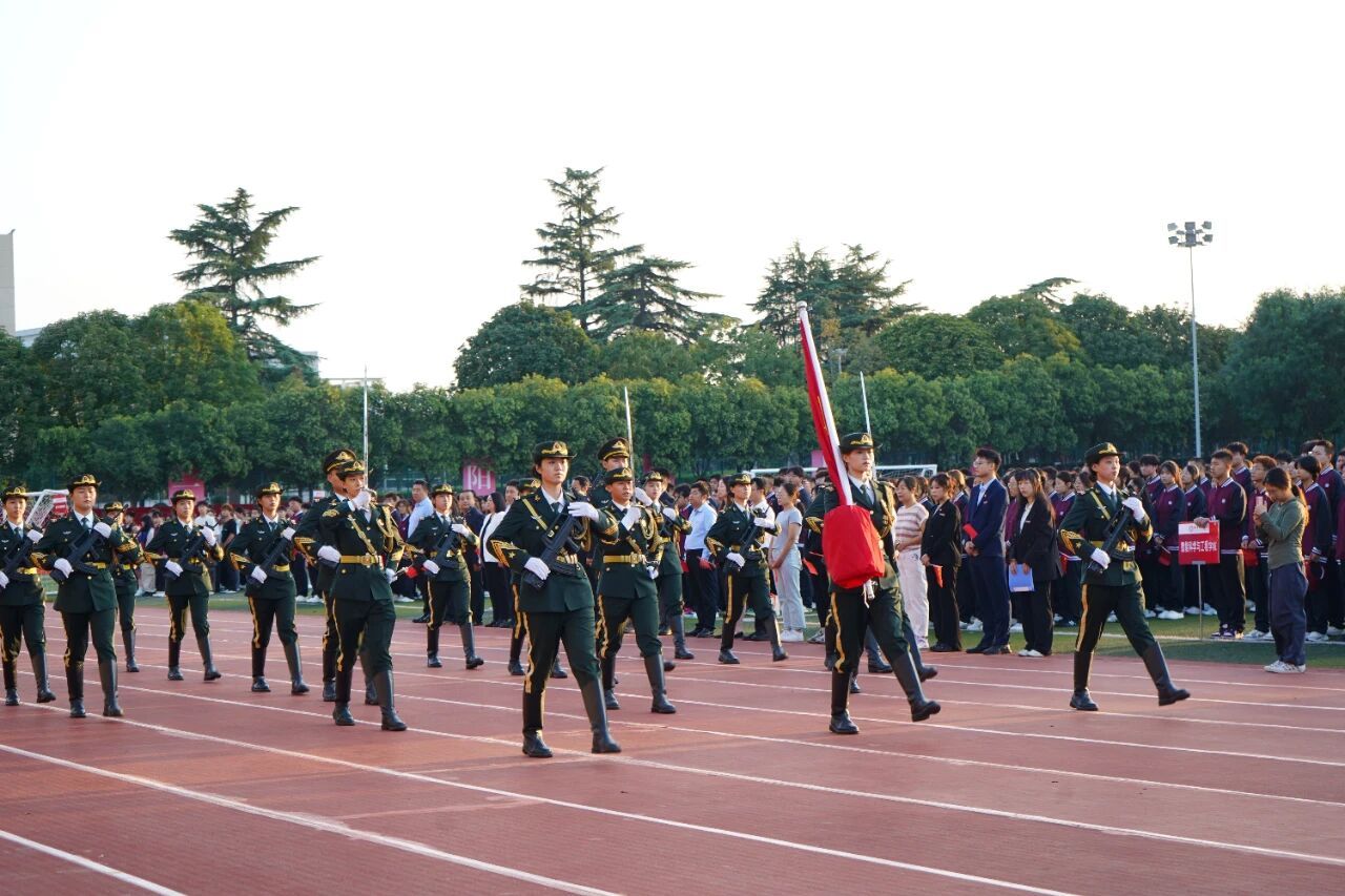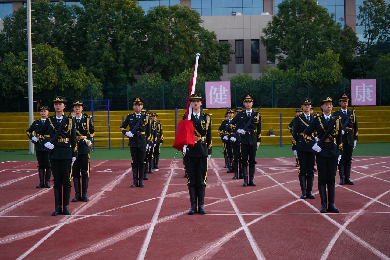 伴随着昂扬的乐曲,国旗护卫队队员迈着铿锵有力的步伐,昂首挺胸护送国旗走向升旗台。整齐的步伐踏在晨光里,每一步都彰显着对国旗的崇敬,唤起师生心中的庄严感与自豪感。全体师生肃立注目,嘹亮的歌声回荡在体育场上空,爱国情怀在每个人的心中激荡,也为新生的大学征程写下庄重开篇。