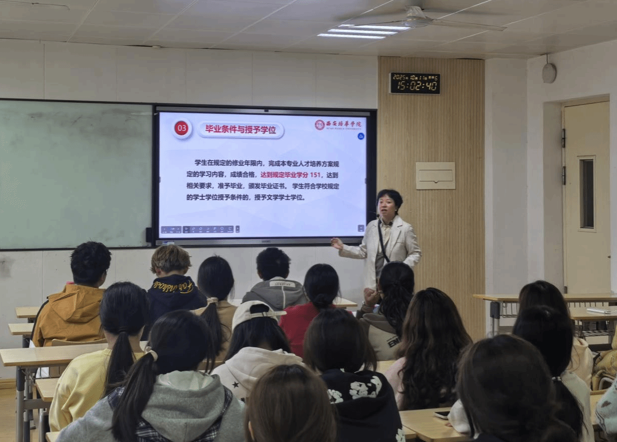 最后,学业导师对大家比较关注的问题,即就业前景与就业方向进行了进一步的讲解。在介绍就业前景时,导师们对学院近年来毕业生在“考公、考编、考研”等高质量发展赛道上的优异表现进行了介绍:在2025年陕西公务员拟聘用单位人员毕业院校统计中,我校名列第八位;我院2024届多名优秀毕业生成功考入北京林业大学、云南大学、香港城市大学、延安大学、西安外国语大学等国内知名学府,继续在中国语言文学、学科教学语文、国际中文教育等方向深耕。这充分体现了本院扎实的本科教学质量和深厚的学术培养能力,为有志于学术研究的同学提供了坚实的平台。