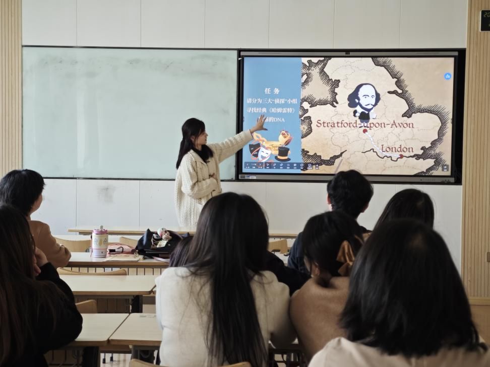 本次活动的核心报告环节由张馨月老师主讲。她结合近期教学实践与前沿教研成果,聚焦“跨学科融合”的核心诉求,从教学目标重构、内容整合、方法创新三个维度展开分享。张老师提出,外国文学教学可与历史学、艺术学、哲学等学科深度联动,通过史料佐证、影像适配、思想碰撞等具体路径,帮助学生构建多维度的文本解读框架,切实提升对文学作品的立体认知与文化思辨能力。
