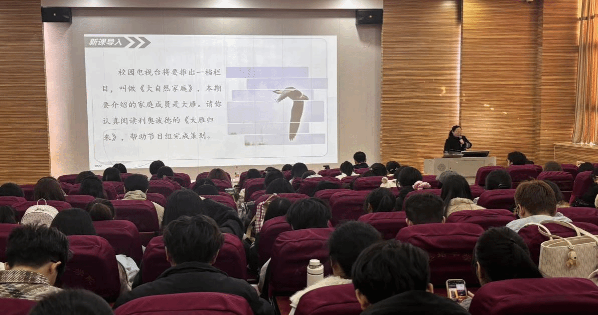 授课过程中,主讲老师娴熟运用情景教学法,通过精心设计的教学环节,生动展示了《大雁归来》《美丽的颜色》以及《背影》三个经典课例。她不仅深刻诠释了新课标所倡导的以学生为中心、注重素养培育的教学理念,更在现场真实再现了中学语文课堂的魅力和深度,让未来的教师们直观感受到理论如何有效转化为生动的教学实践。主讲老师深厚的教学功底、富有感染力的语言以及对文本的独到解读,赢得了在场师生的阵阵掌声。